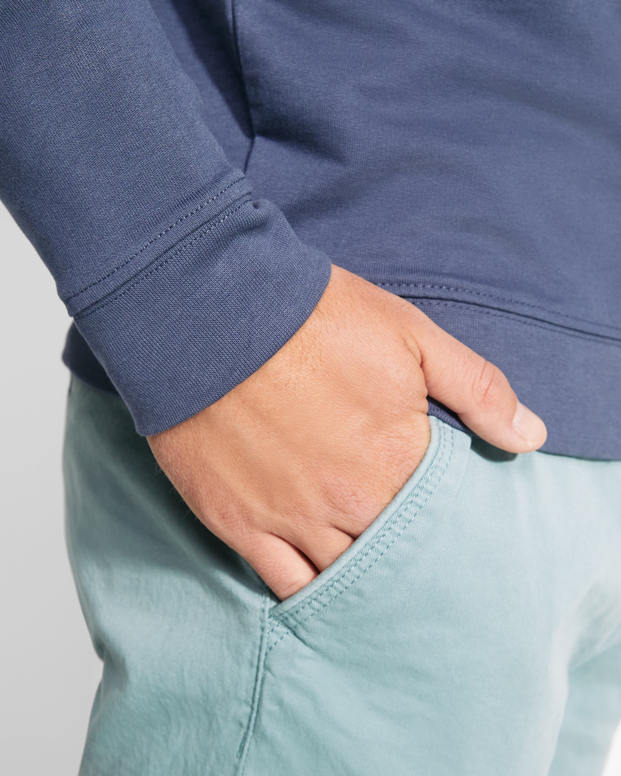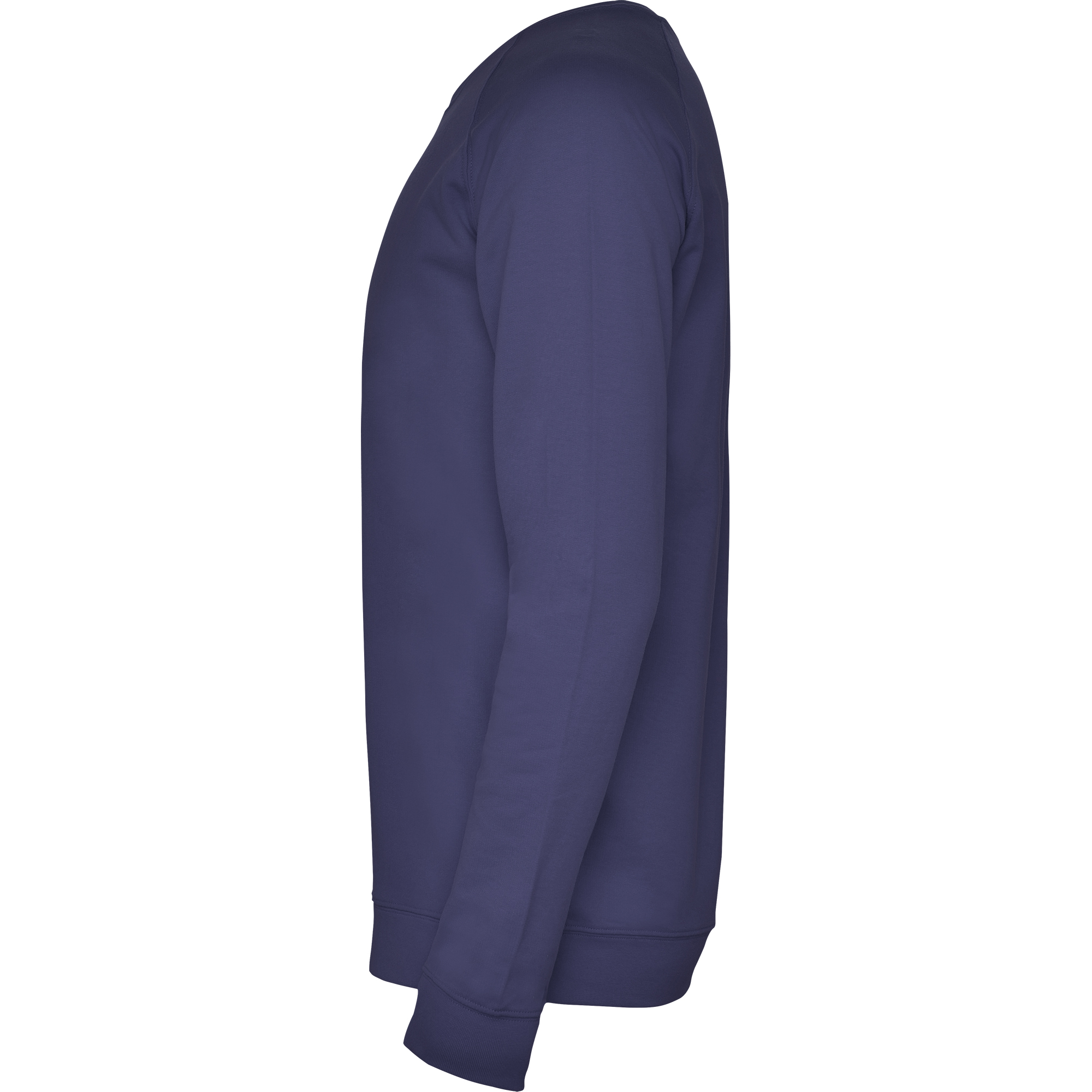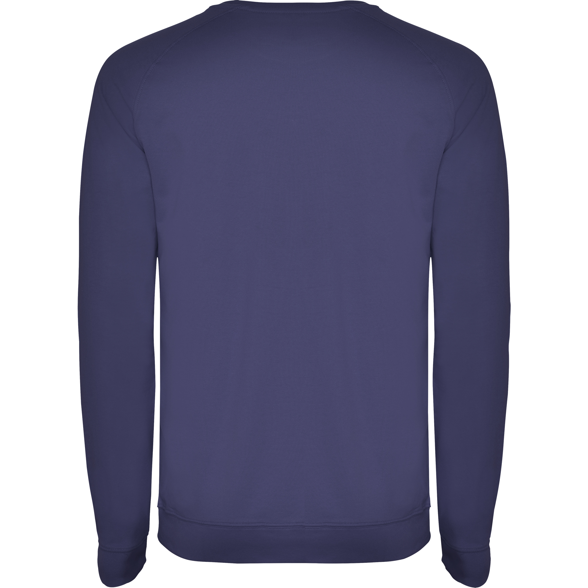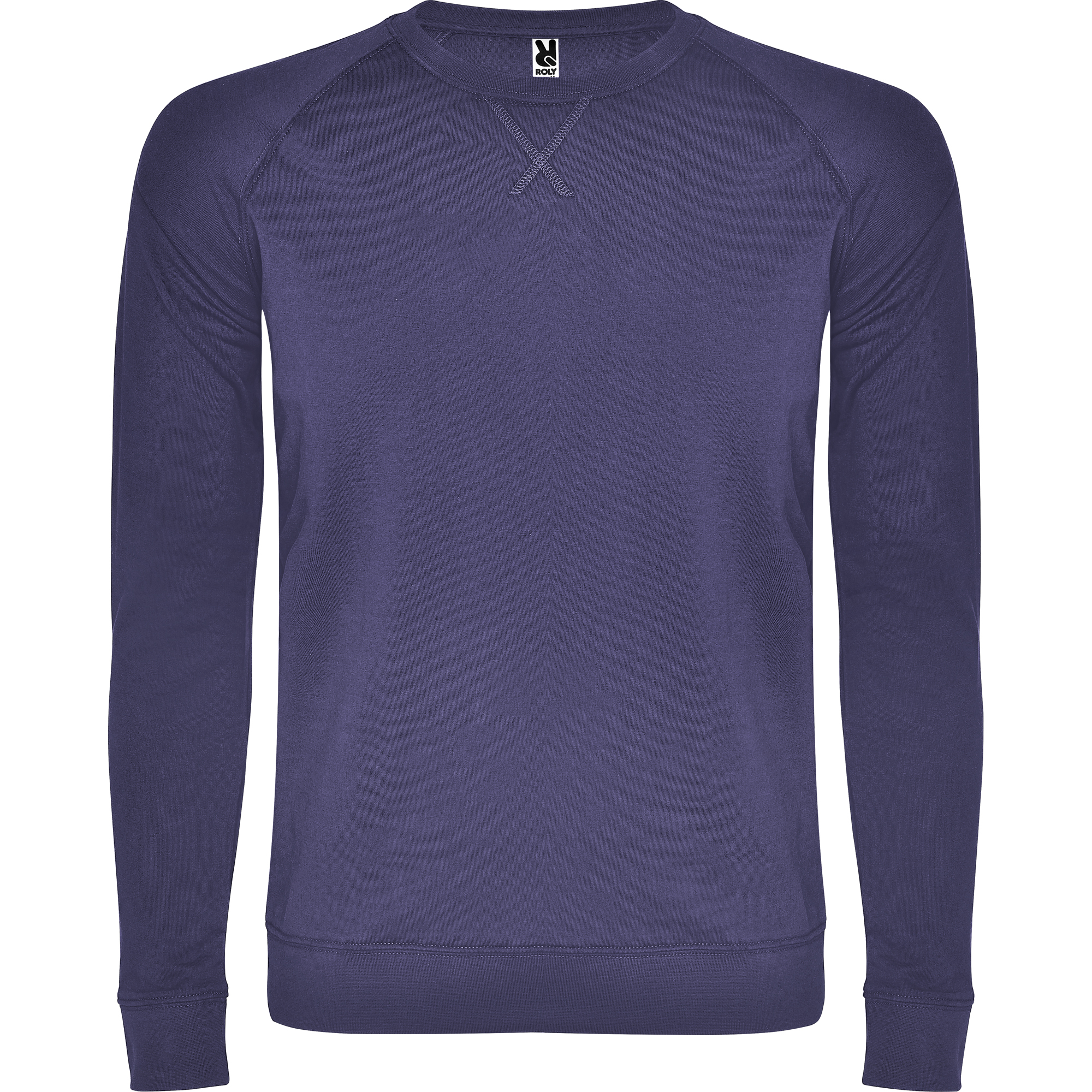 Sudadera de algodón de manga entallada estilo ranglán. Con cuello, puños y cintura, en canalé 1×1. Cuello redondo con adorno de costuras remalladas cruzadas y cubrecosturas de refuerzo en el interior del cuello.