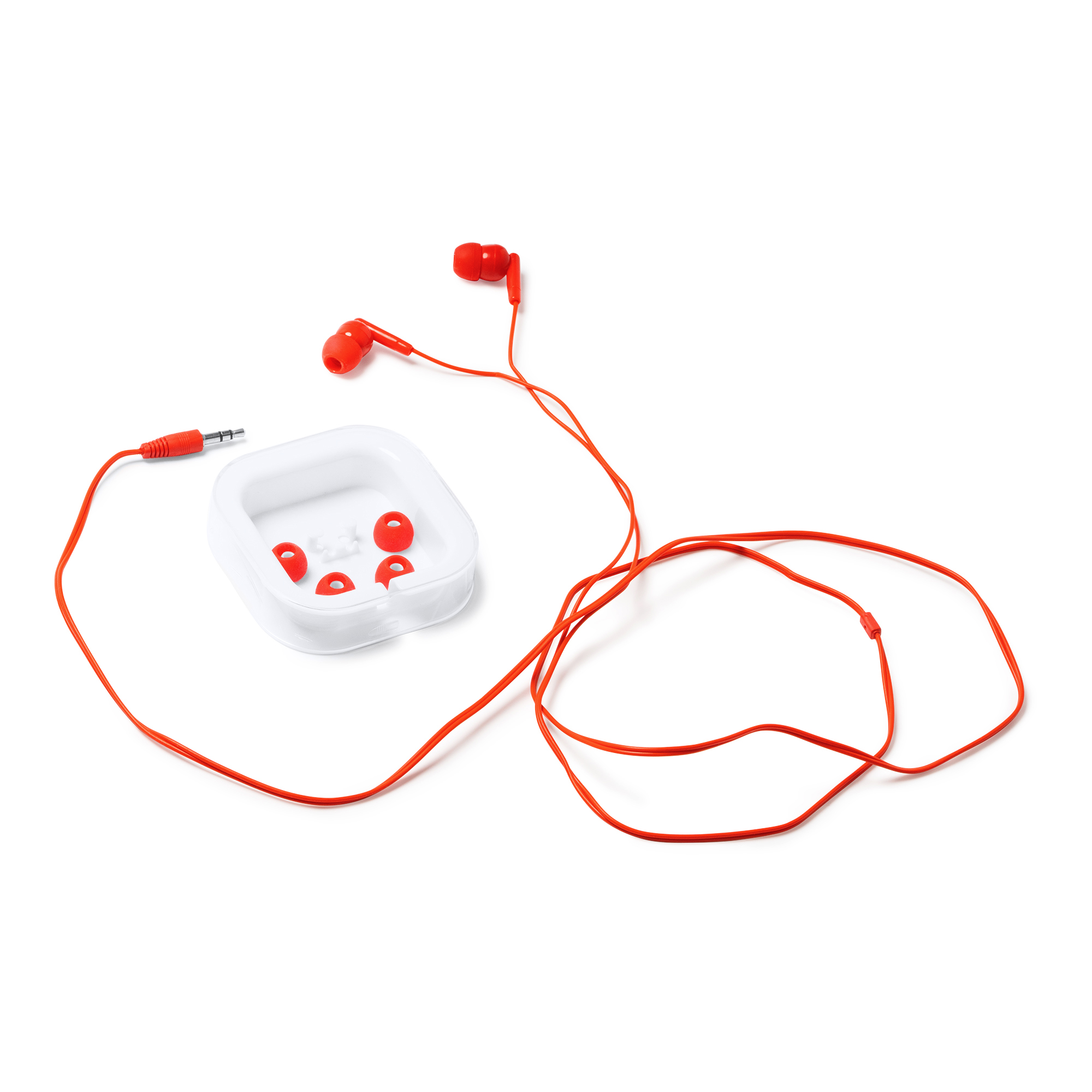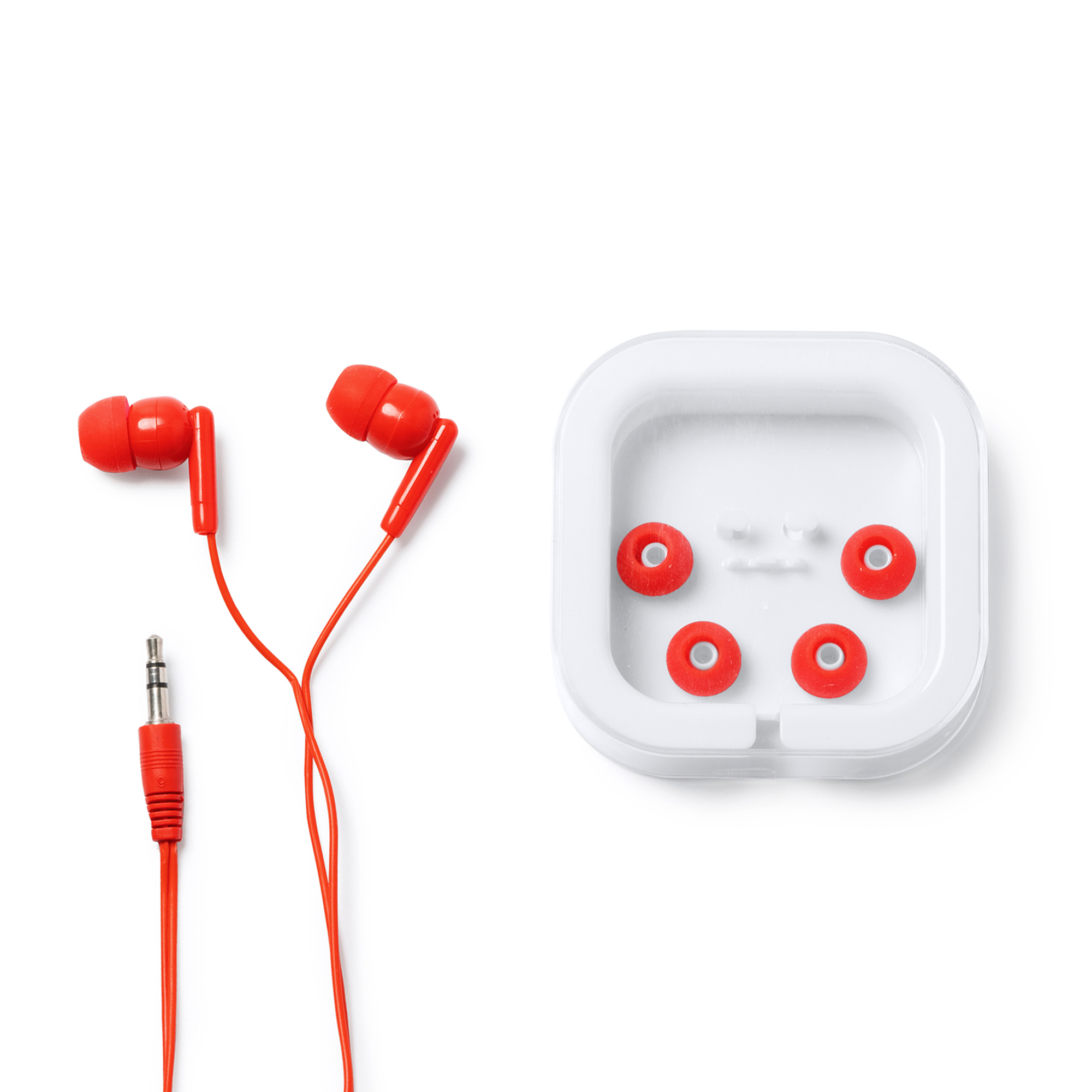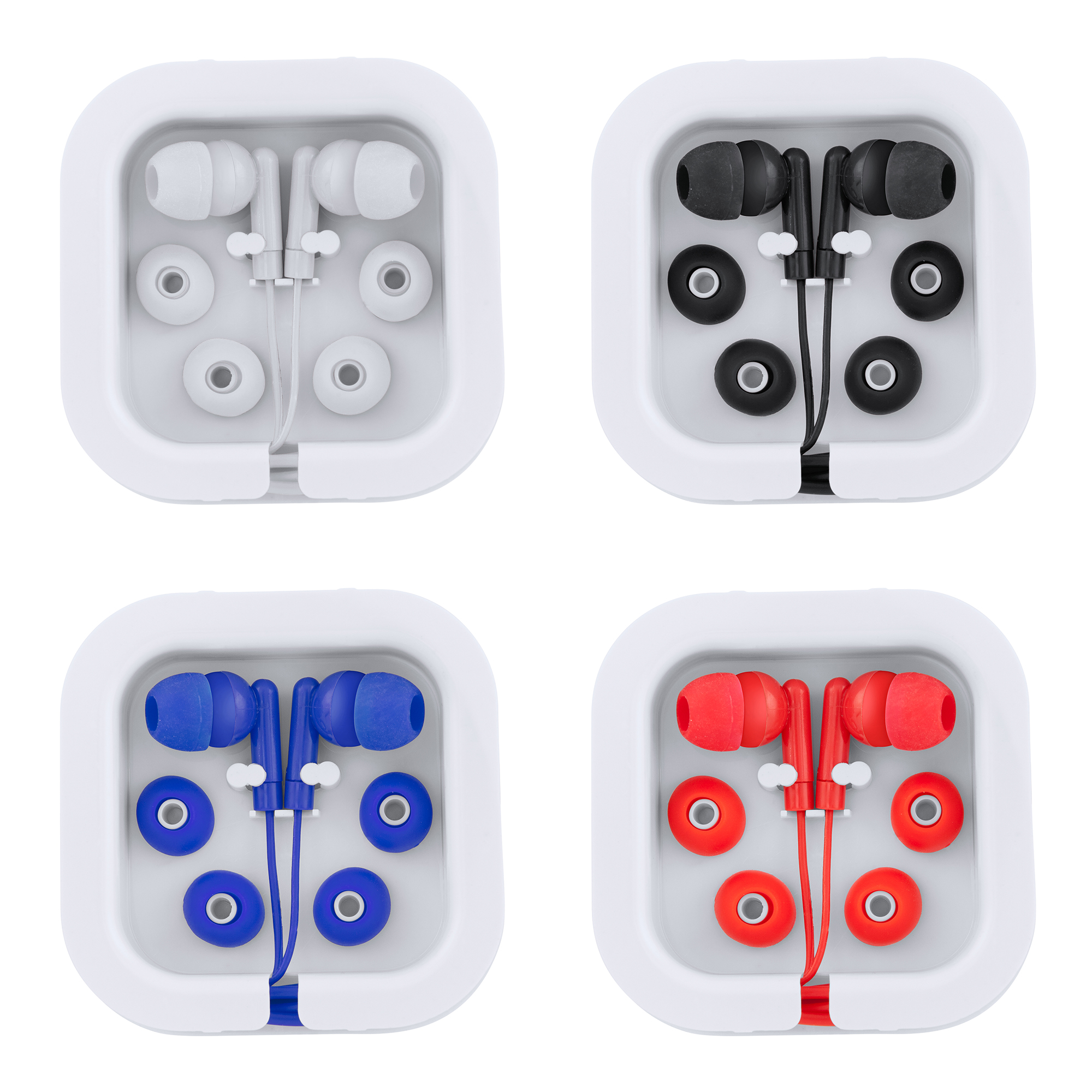 Auriculares presentados en estuche de PS. Conexión Jack 3,5 mm. Cable con botón de seguridad incluido. Incluye 3 pares de fundas de diferentes medidas.