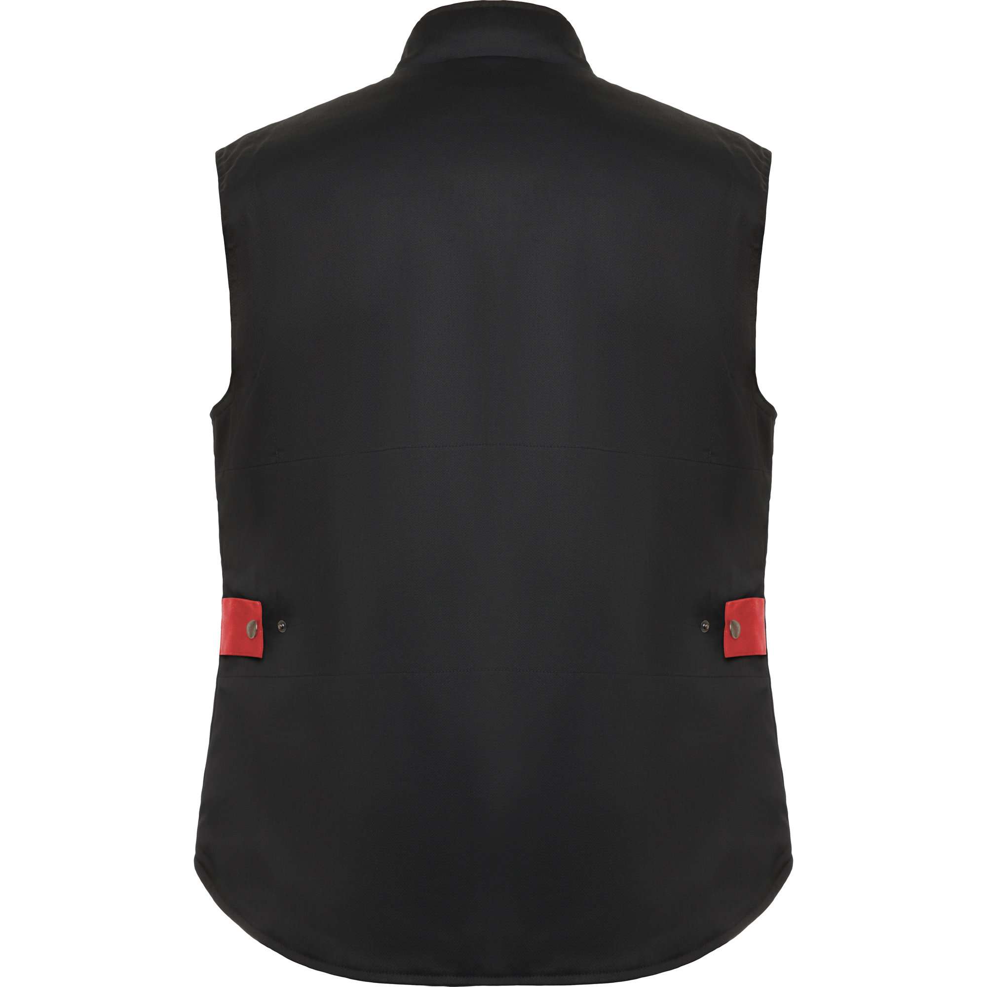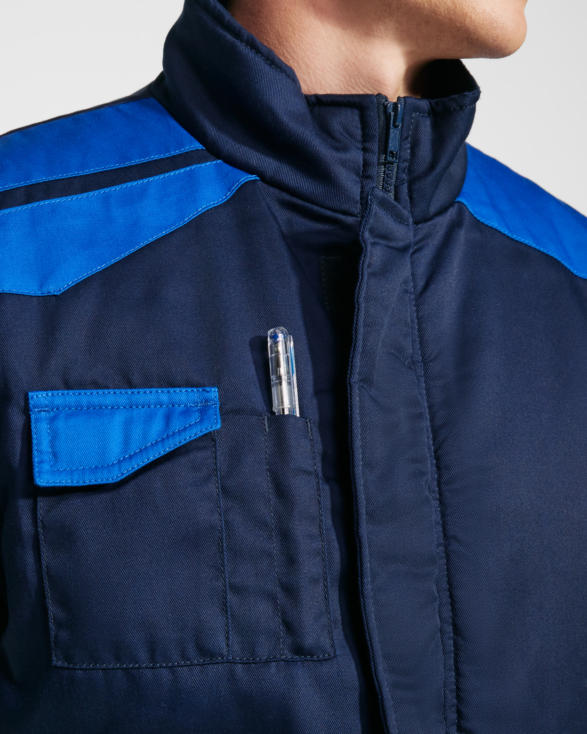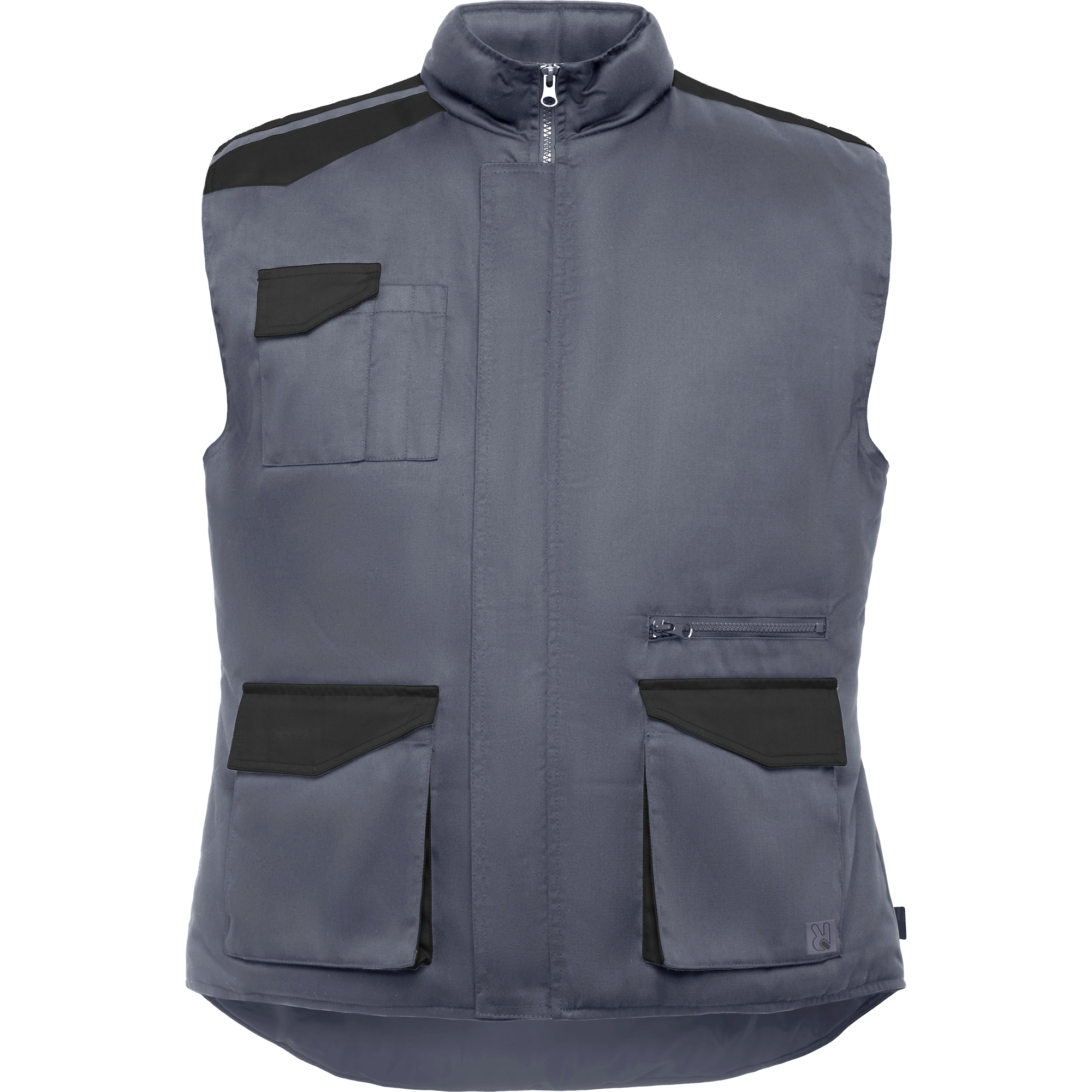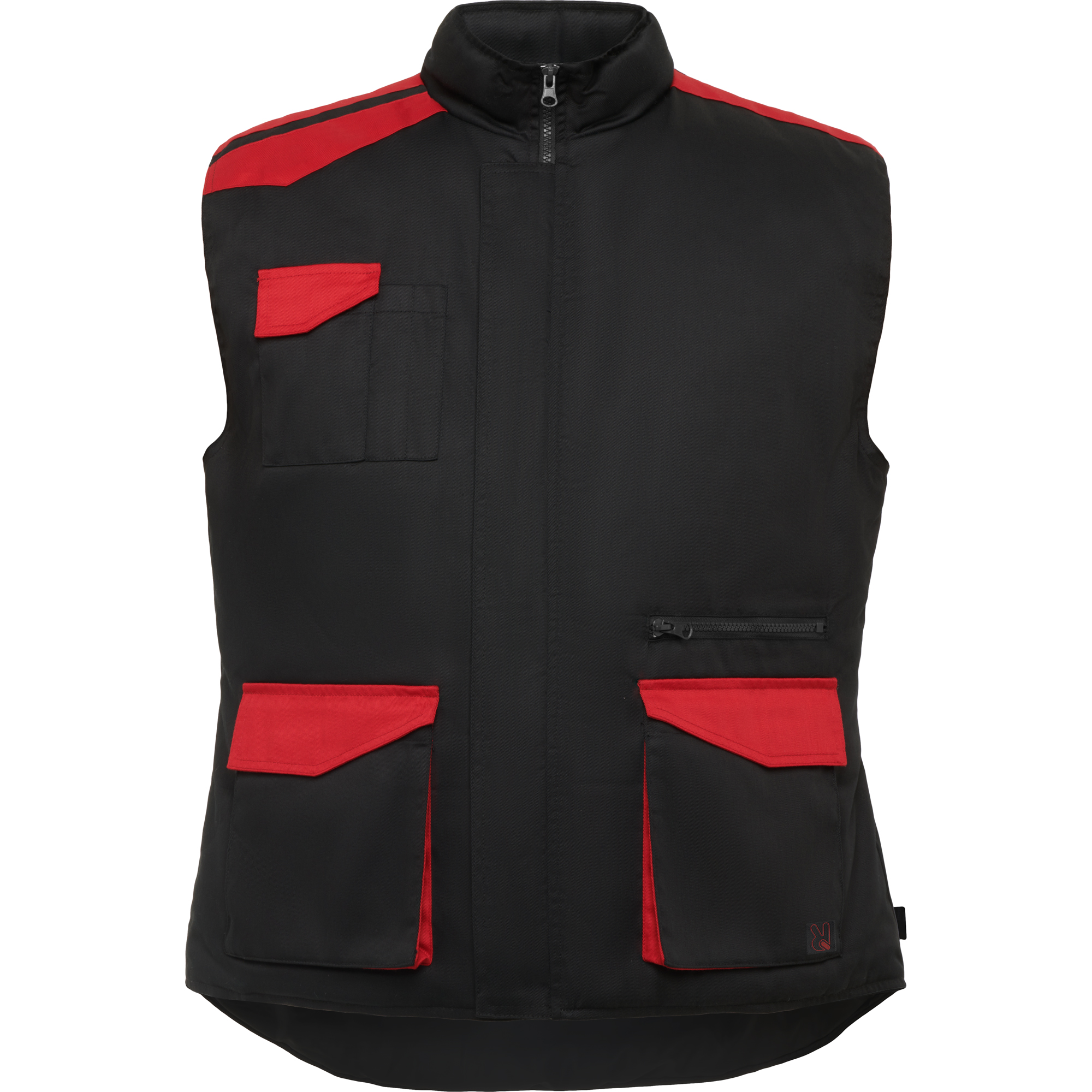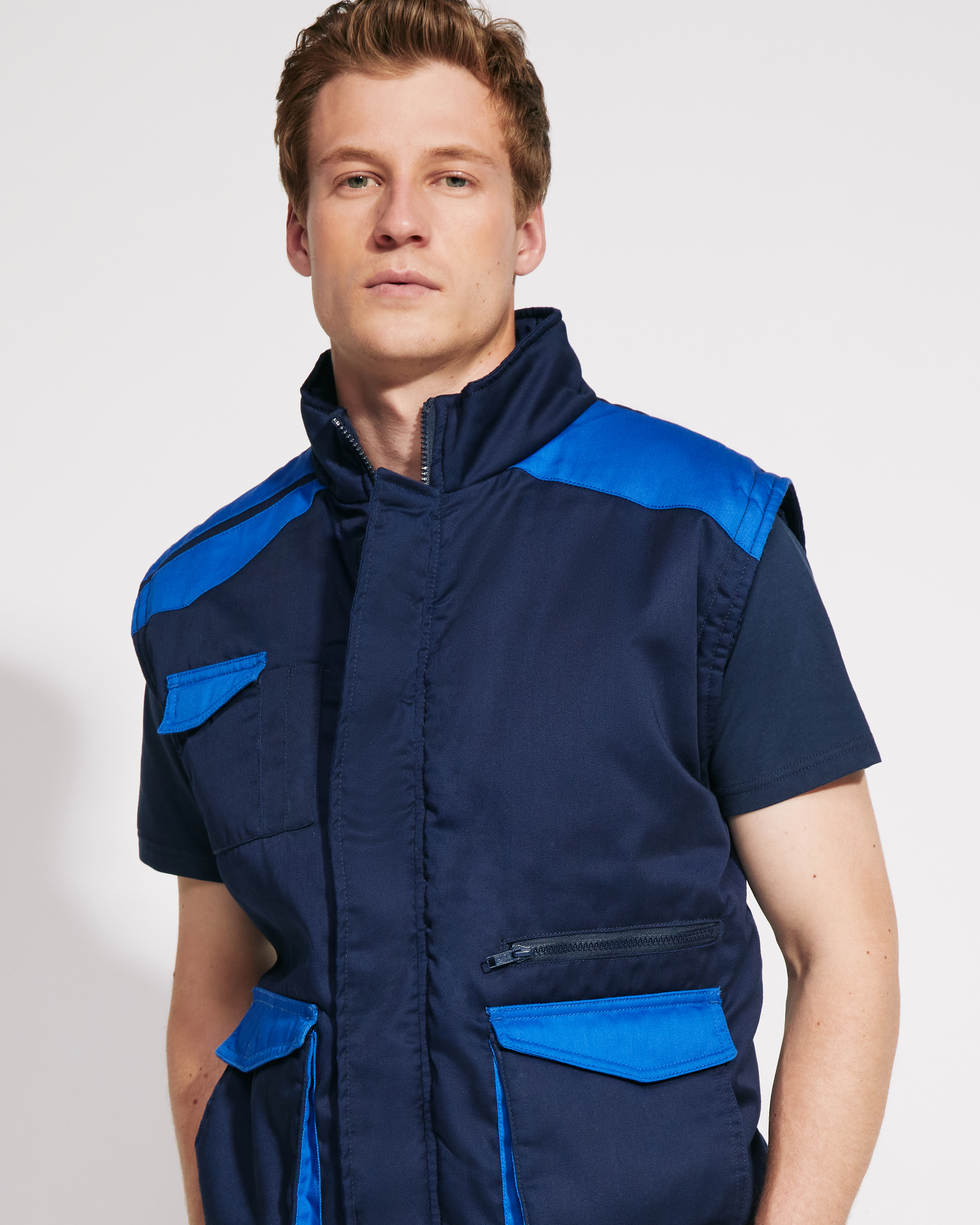 Chaleco laboral multibolsillos con cuello alto en colores combinados.