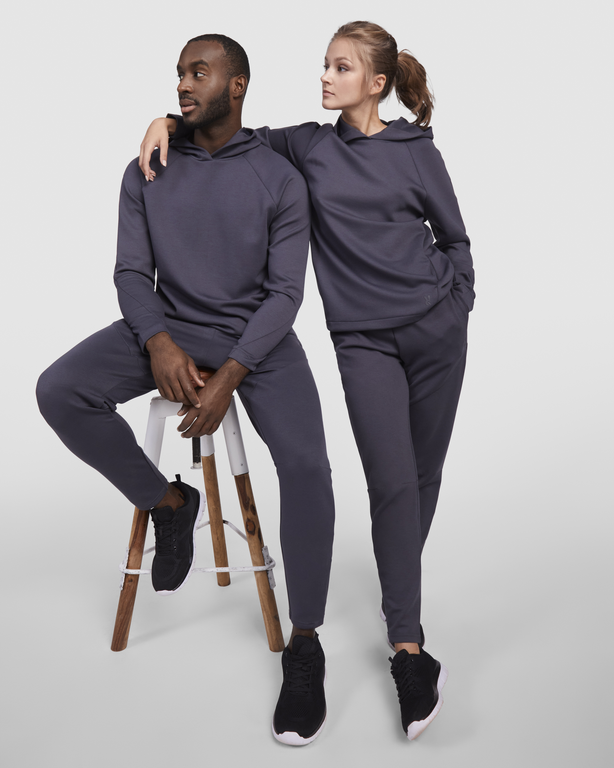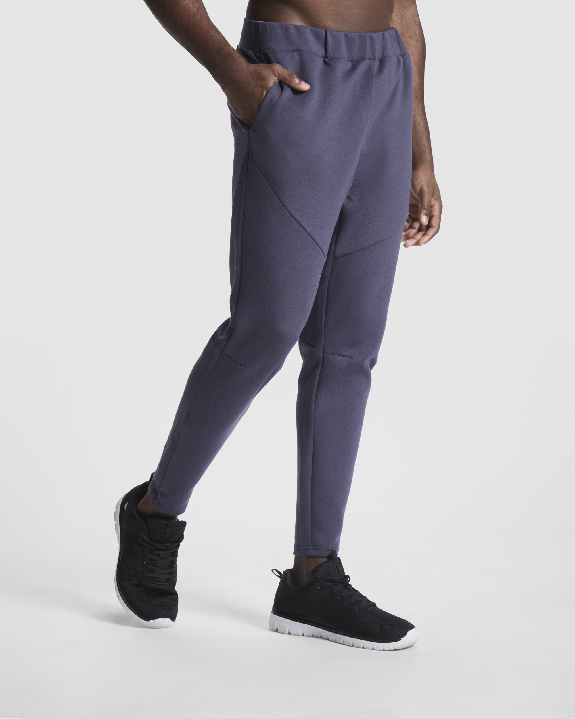 Pantalón de una pieza con pinzas en tejido ligero. Cintura mismo tejido con goma elástica en el interior. Bolsillos integrados en costuras laterales. Pinzas a la altura de las rodillas en parte delantera y trasera. Cremalleras invisibles en los tobillos. Logo Roly al tono en el bolsillo izquierdo.