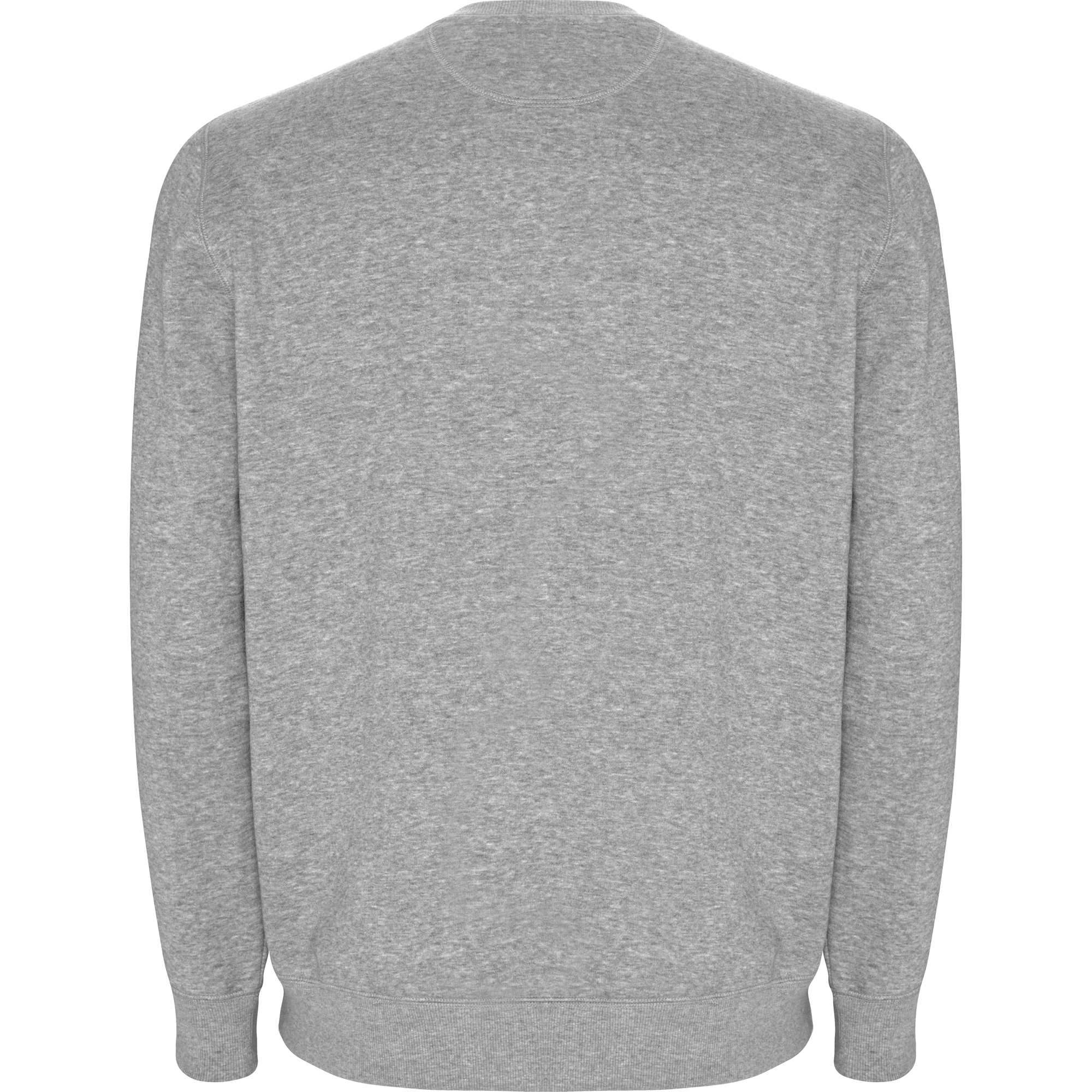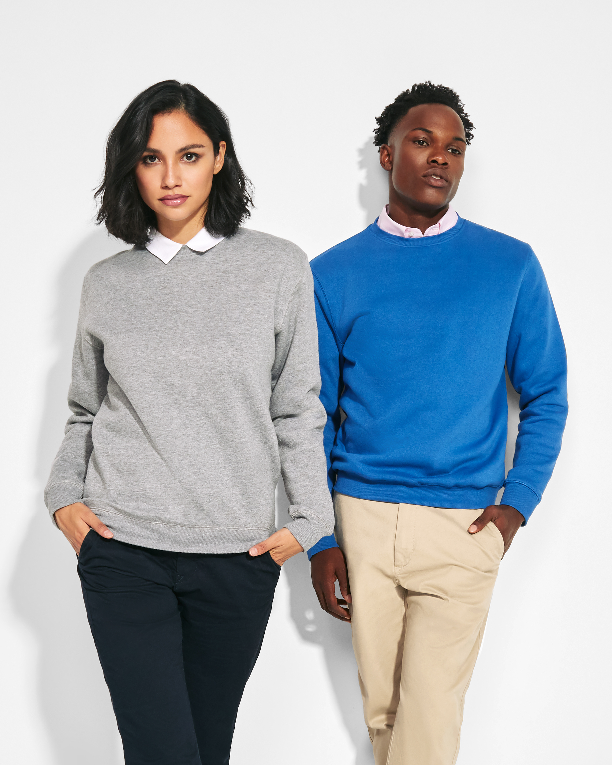 Sudadera Unisex en Algodón Orgánico Peinado y Poliéster Reciclado. Cuello, puños y cinturilla de punto canalé 2×1. Adorno de costuras remalladas en hombro, sisa, cuello, puños y cintura. Media luna en el interior del cuello trasero.