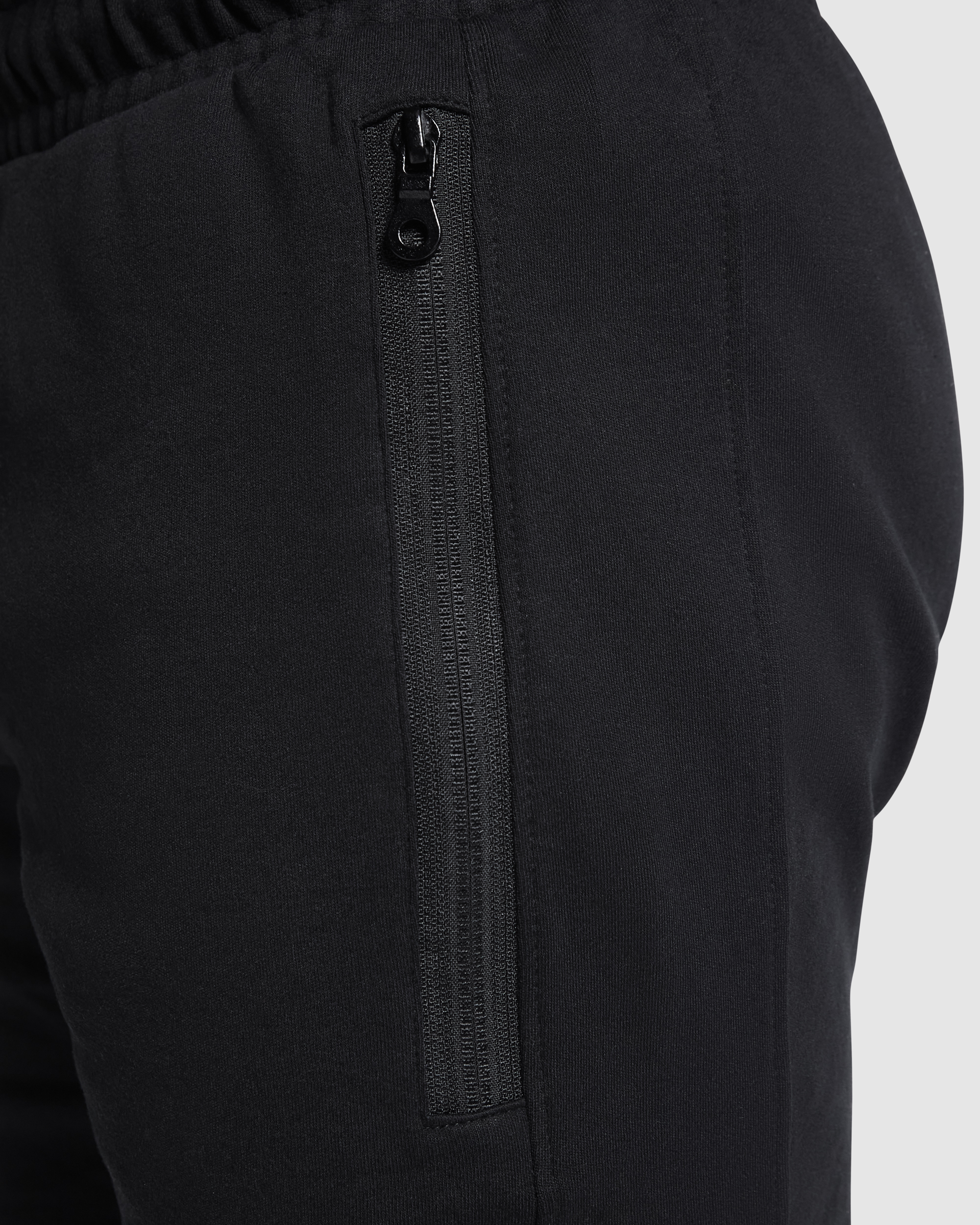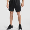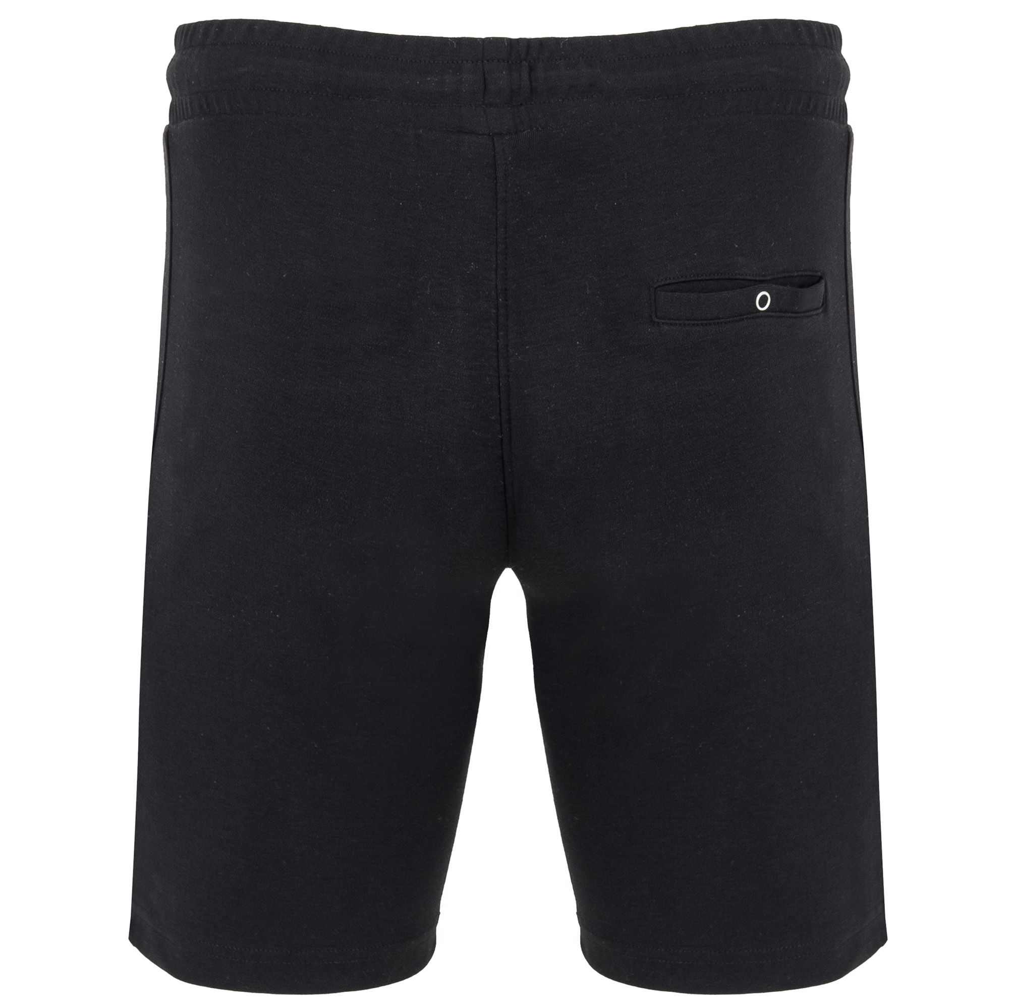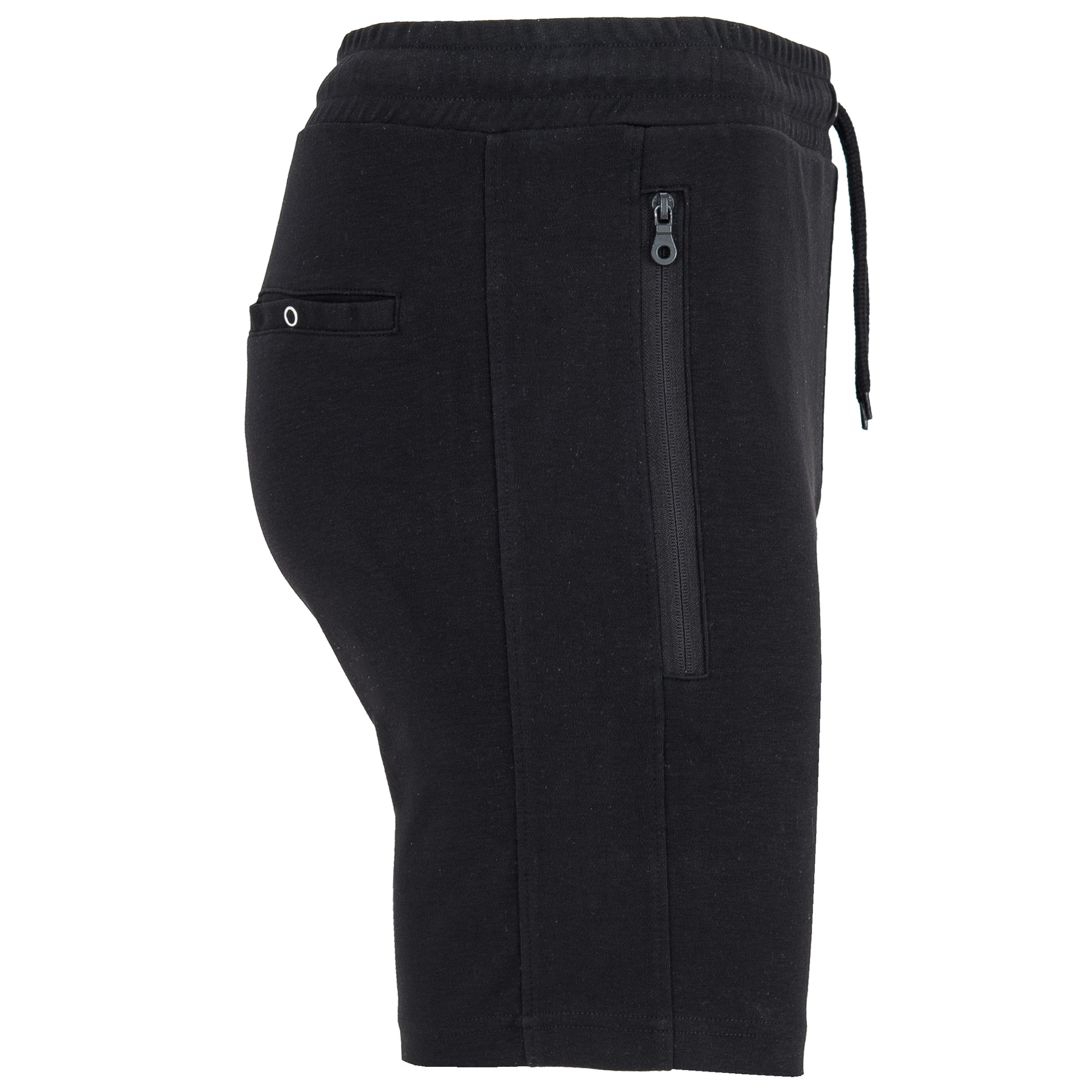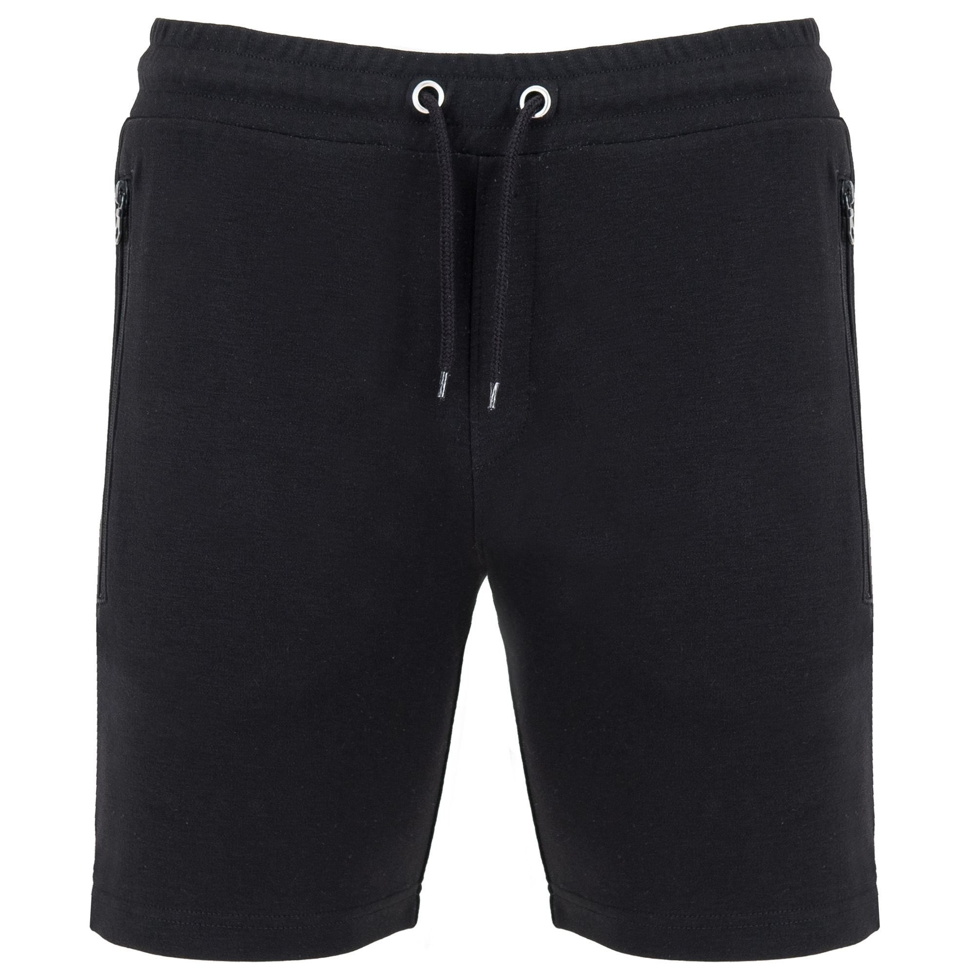 Pantalón corto con cinturilla elástica y cordón con ojales metálicos. Dos bolsillos laterales con cremalleras invertida a tono y tirador. Banda lateral a tono. Adorno de bragueta cosida. Un bolsillo trasero con broche de presión.