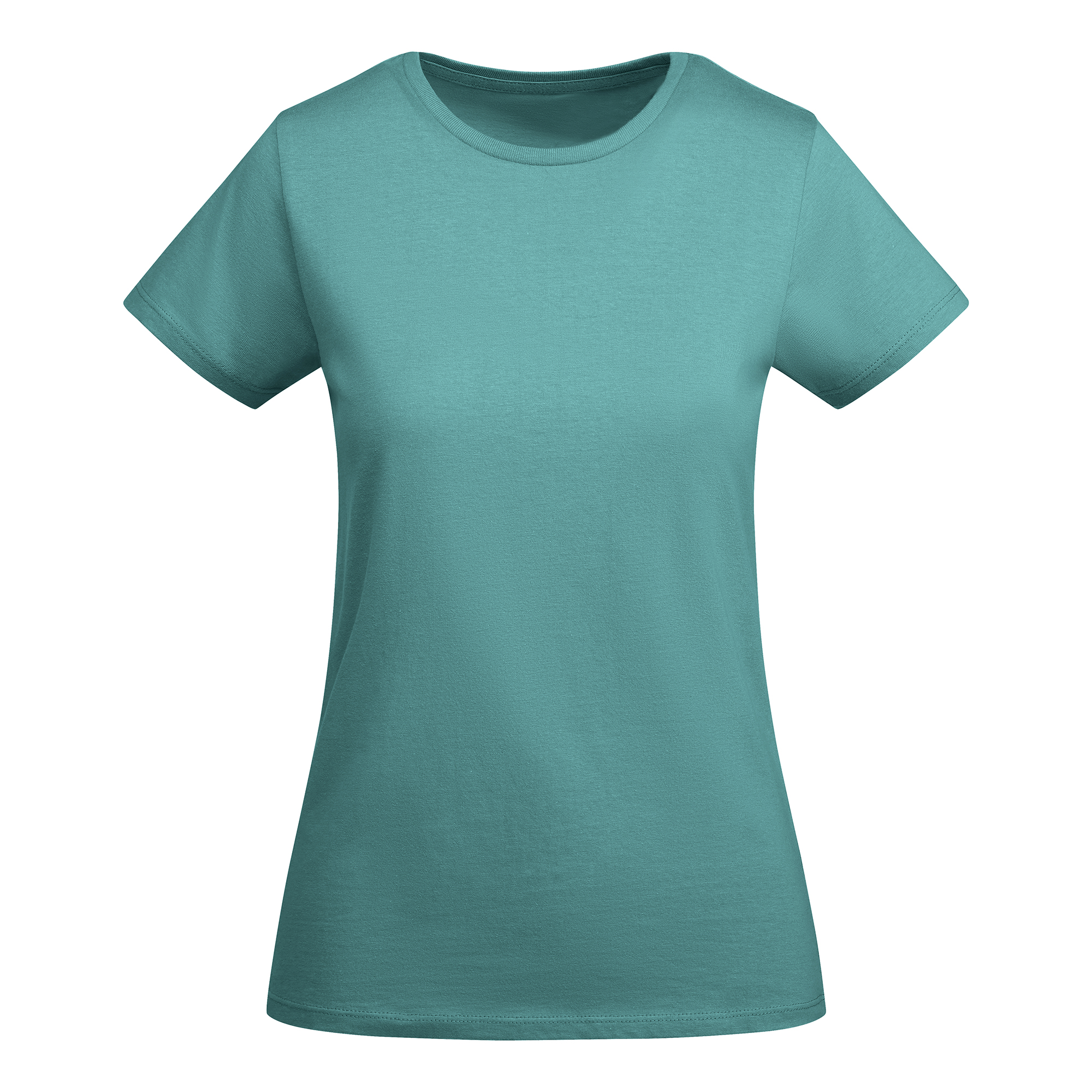 Camiseta de mujer entallada de manga corta en algodón orgánico certificado OCS. Cuello redondo en canalé 1×1. Cubrecosturas reforzado en cuello. Costuras laterales.
