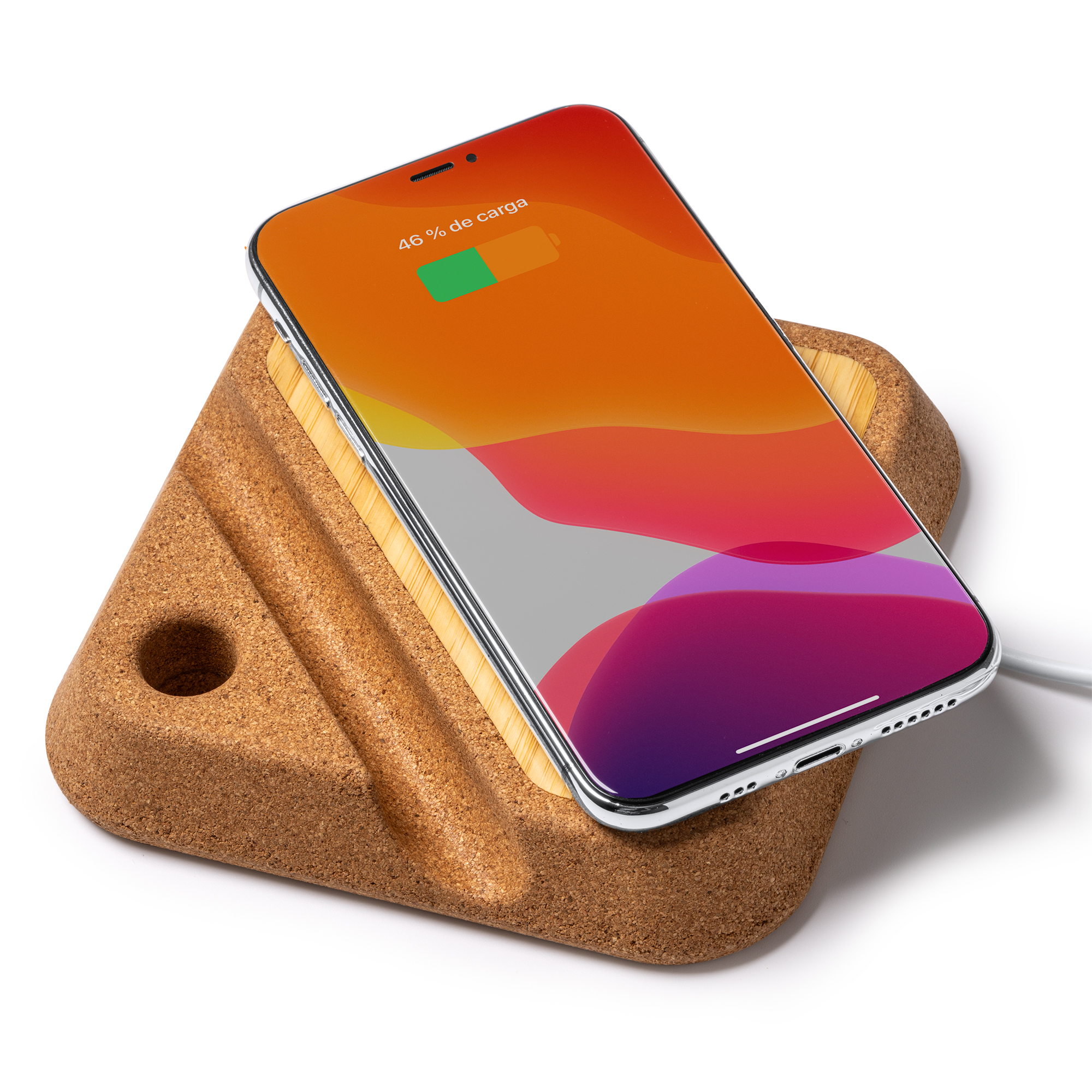 El cargador inalámbrico de cuerpo combinado en bambú y corcho es una opción elegante y sostenible para cargar tus dispositivos de forma inalámbrica.