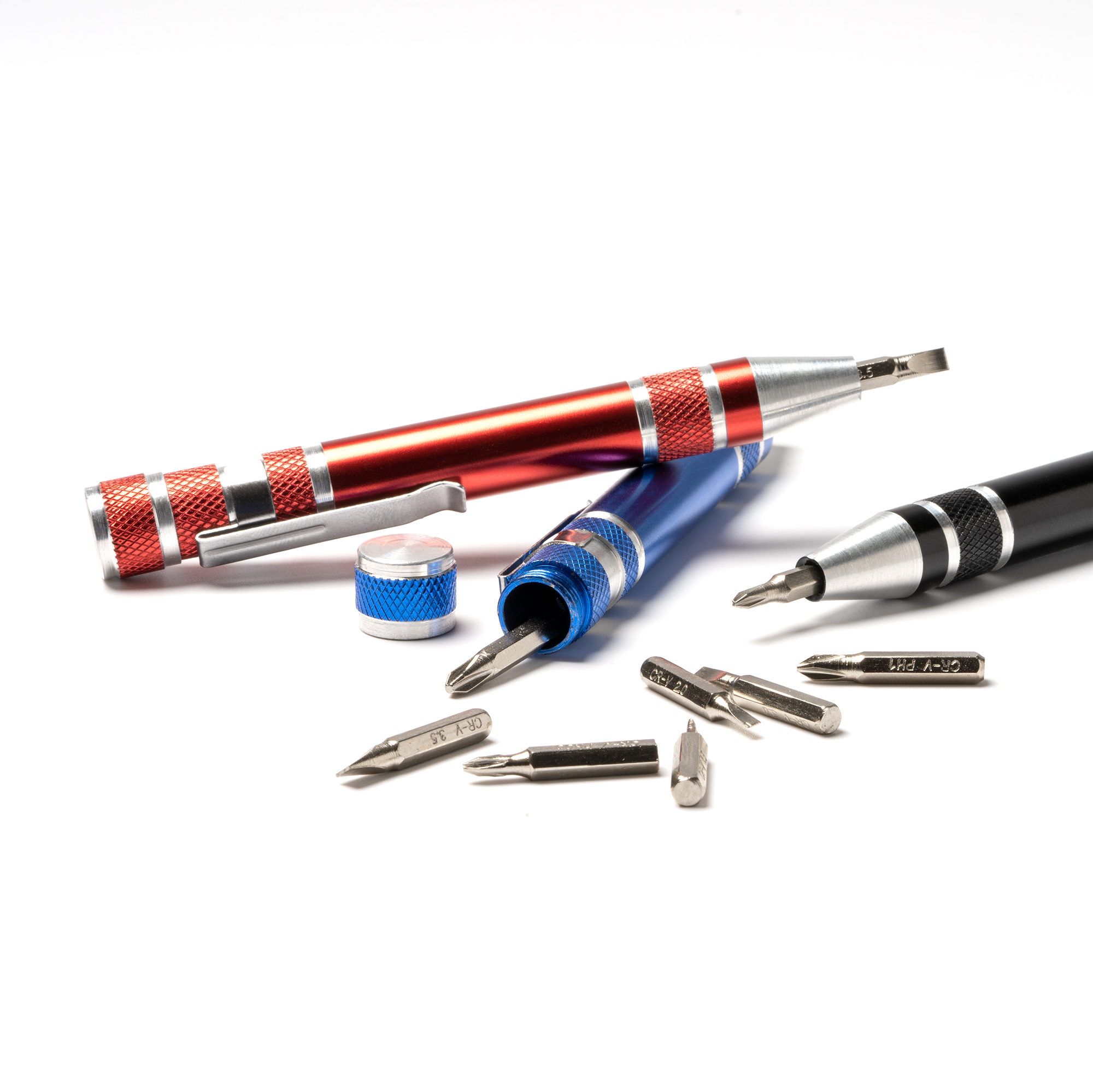 Multiherramienta de aluminio en forma de bolígrafo. Incluye 8 cabezales de destornillador, estrella y planos.