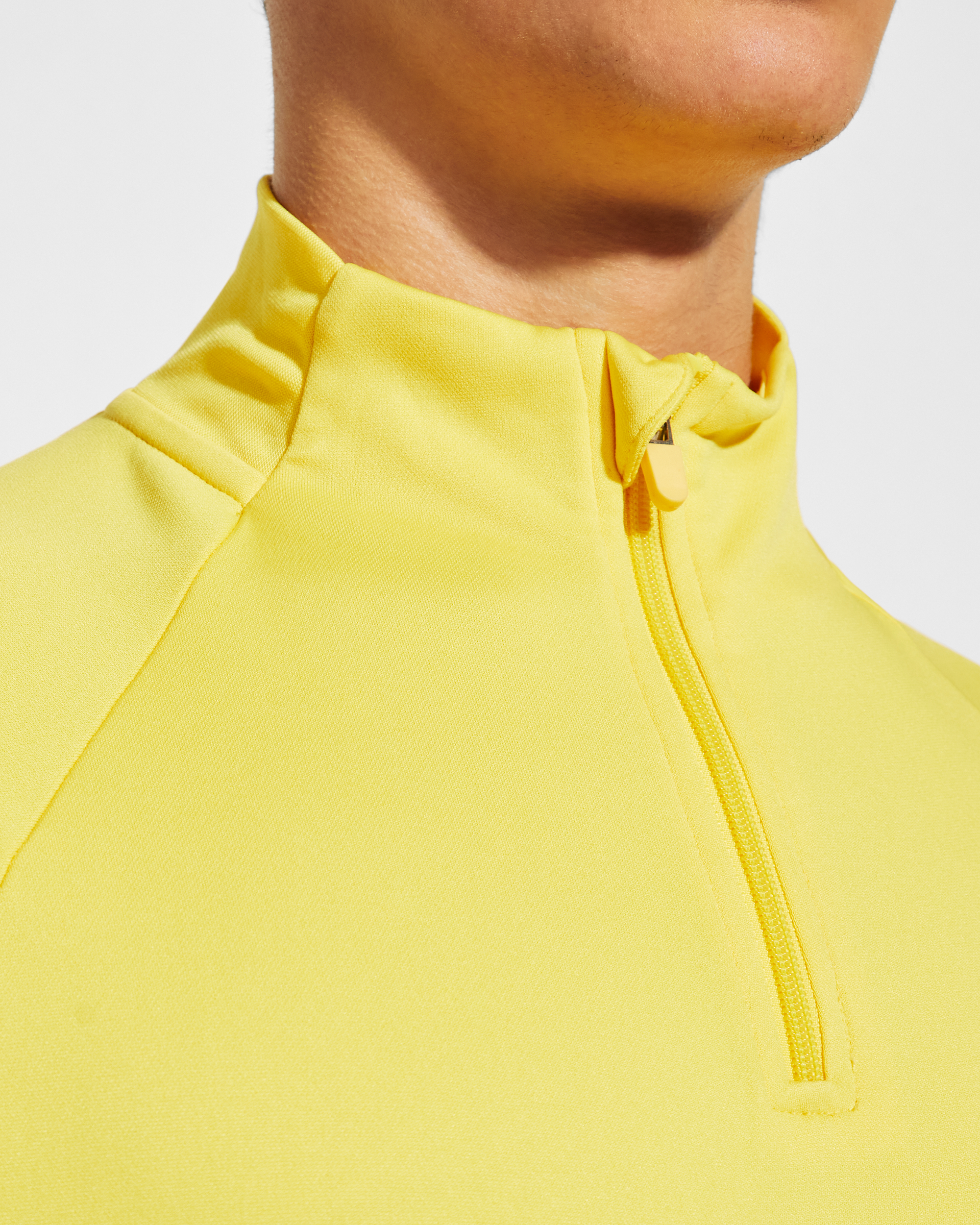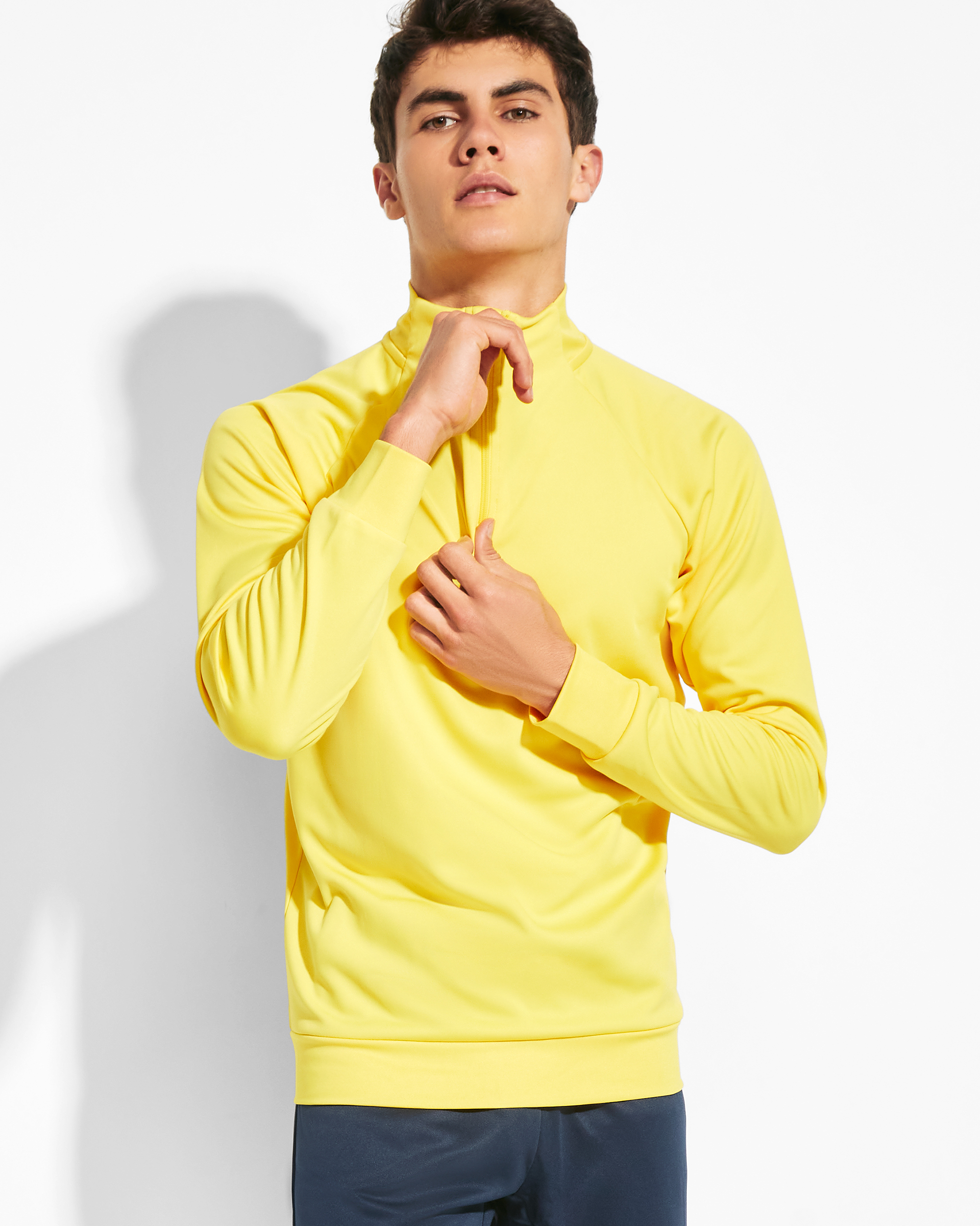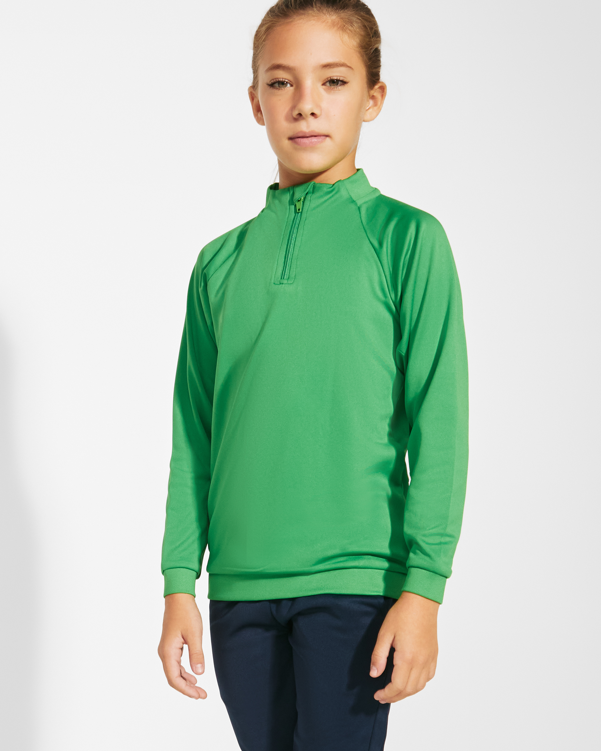 Sudadera de manga ranglán, con Interior perchado, cuello con media cremallera y cubrecosturas de refuerzo en su interior a tono. Parte posterior del cuello, puños y bajo en canalé 1×1.