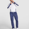 Chándal en tejido ligero y elástico. Chaqueta con pecho a contraste de color y vivo. Cuello alto con cubrecosturas a contraste. Cremallera central. Bolsillos laterales. Puños y cintura en canalé 2×2. Pantalón con cintura elástica y cordón de ajuste. Pieza lateral a contraste con vivo. Bajo con cremallera.