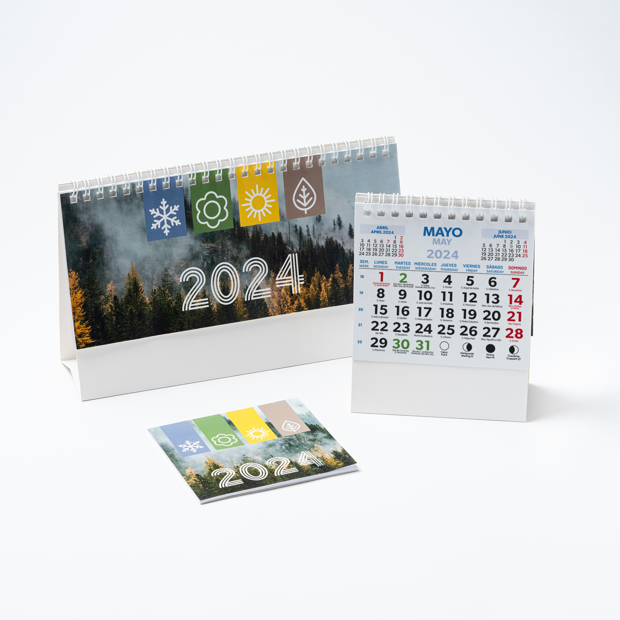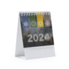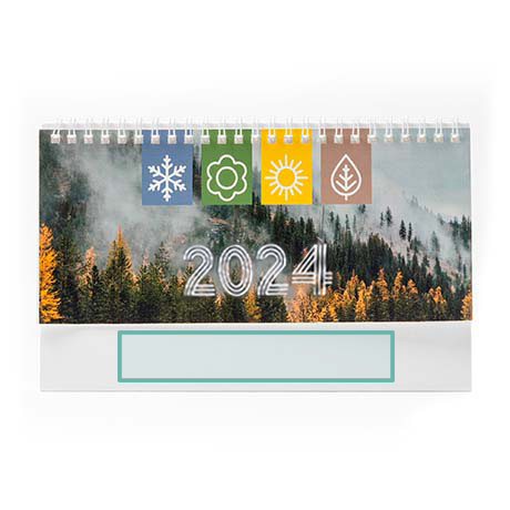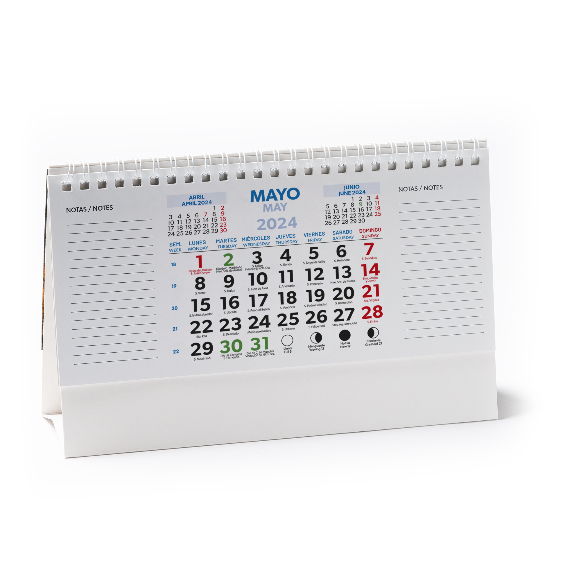 Calendario de sobremesa horizontal con anillas. Diseño mes en curso / mes anterior / mes siguiente / Calendario anual. Incluye santoral. Cuerpo de cartón ideal para marcar.