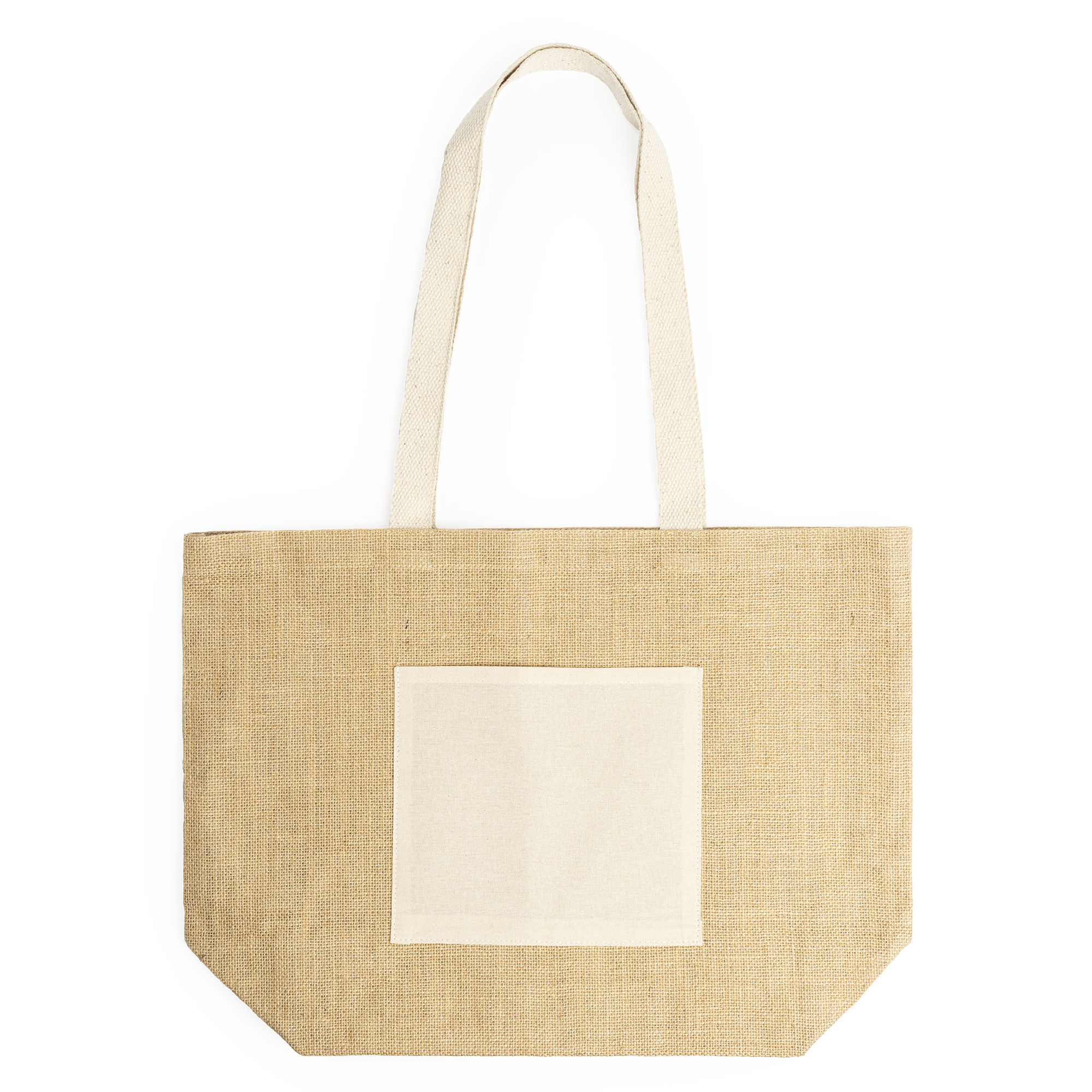 Bolsa de yute laminado con bolsillo frontal y asas largas en algodón natural.