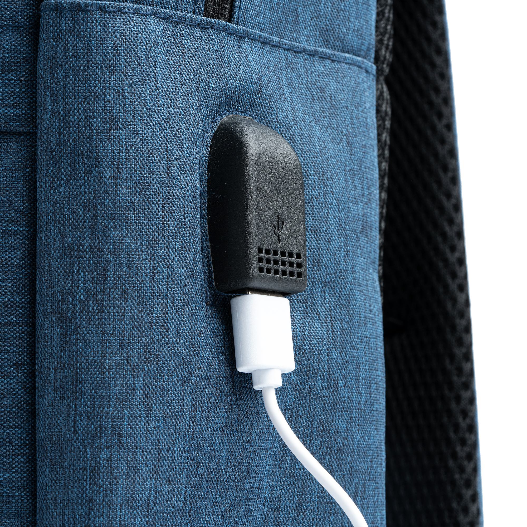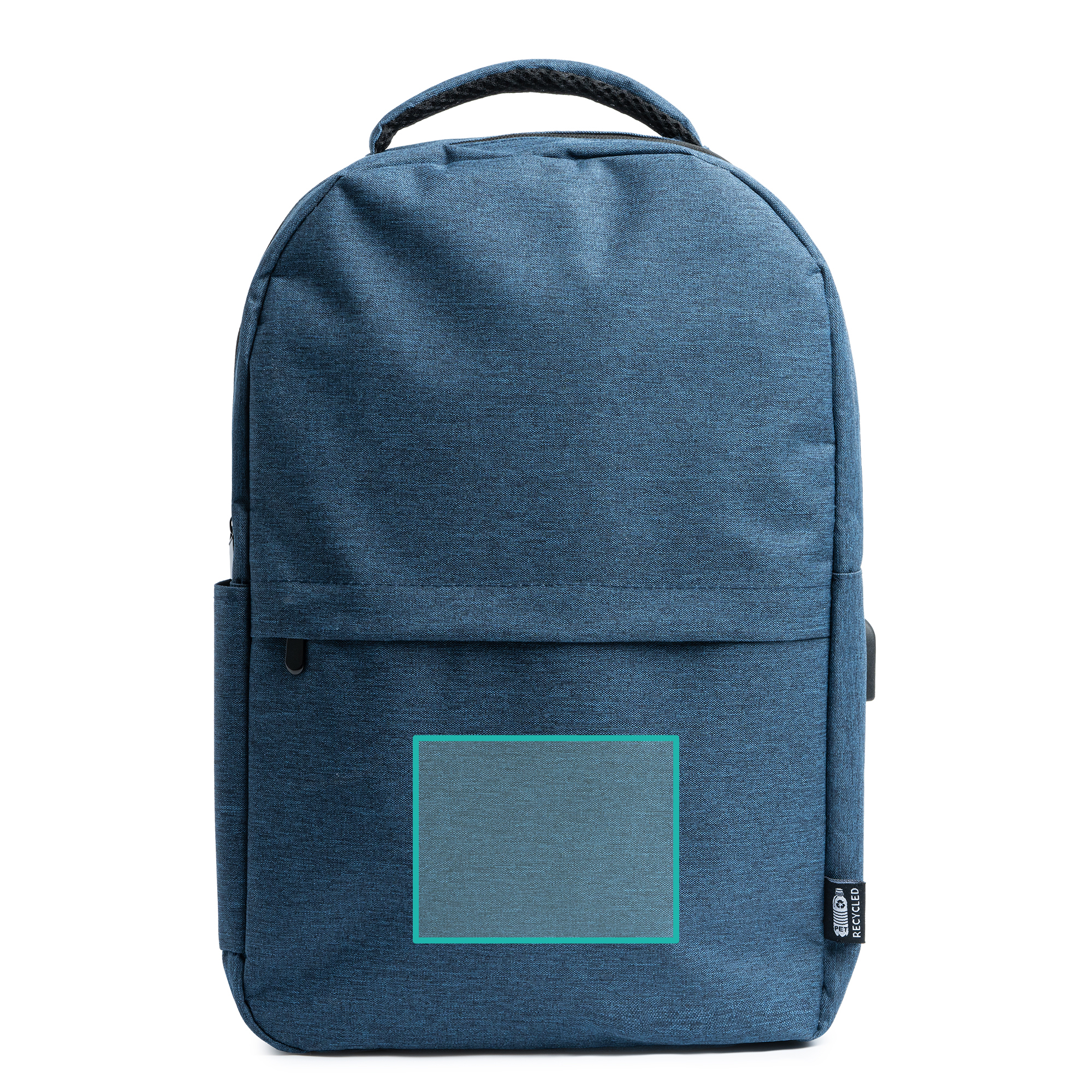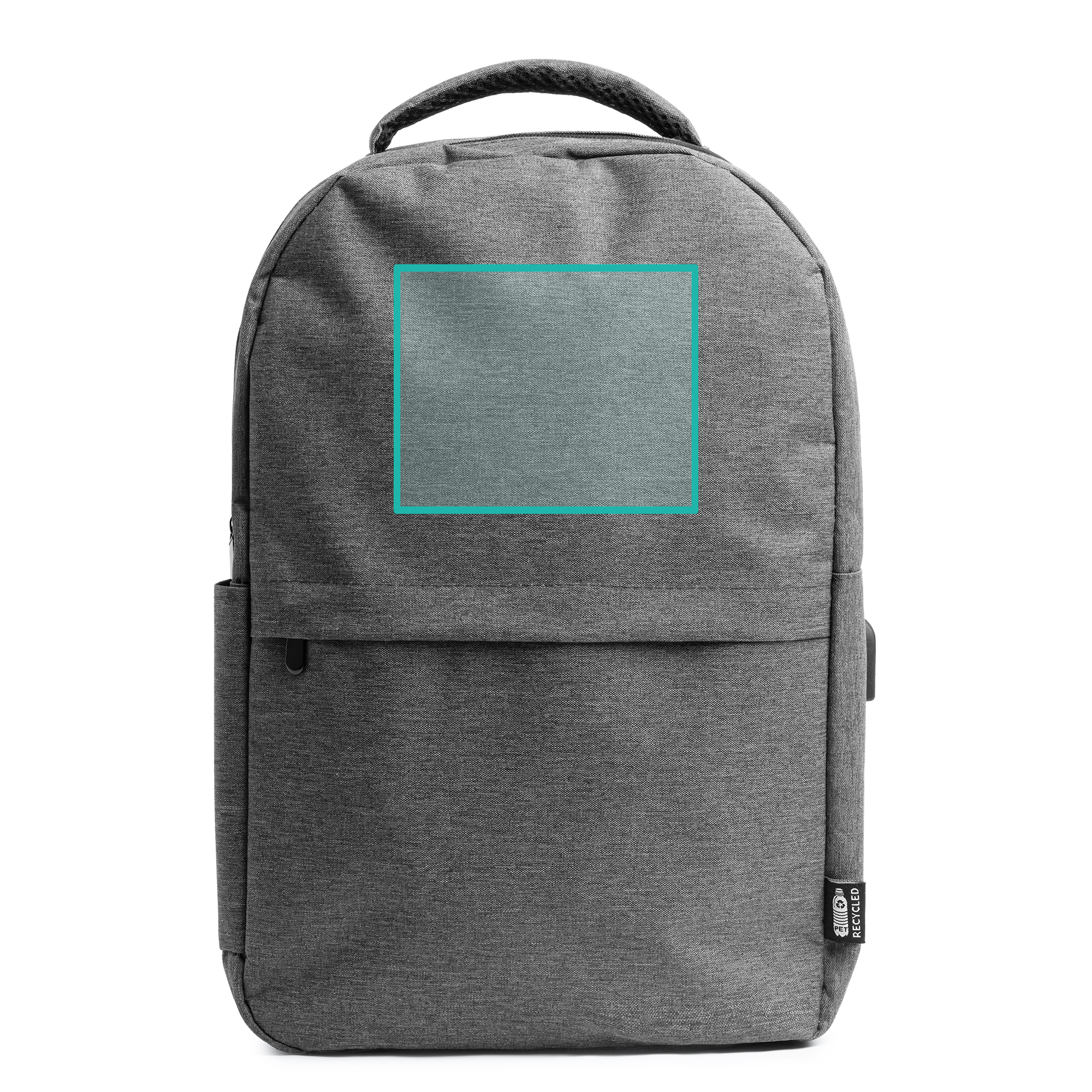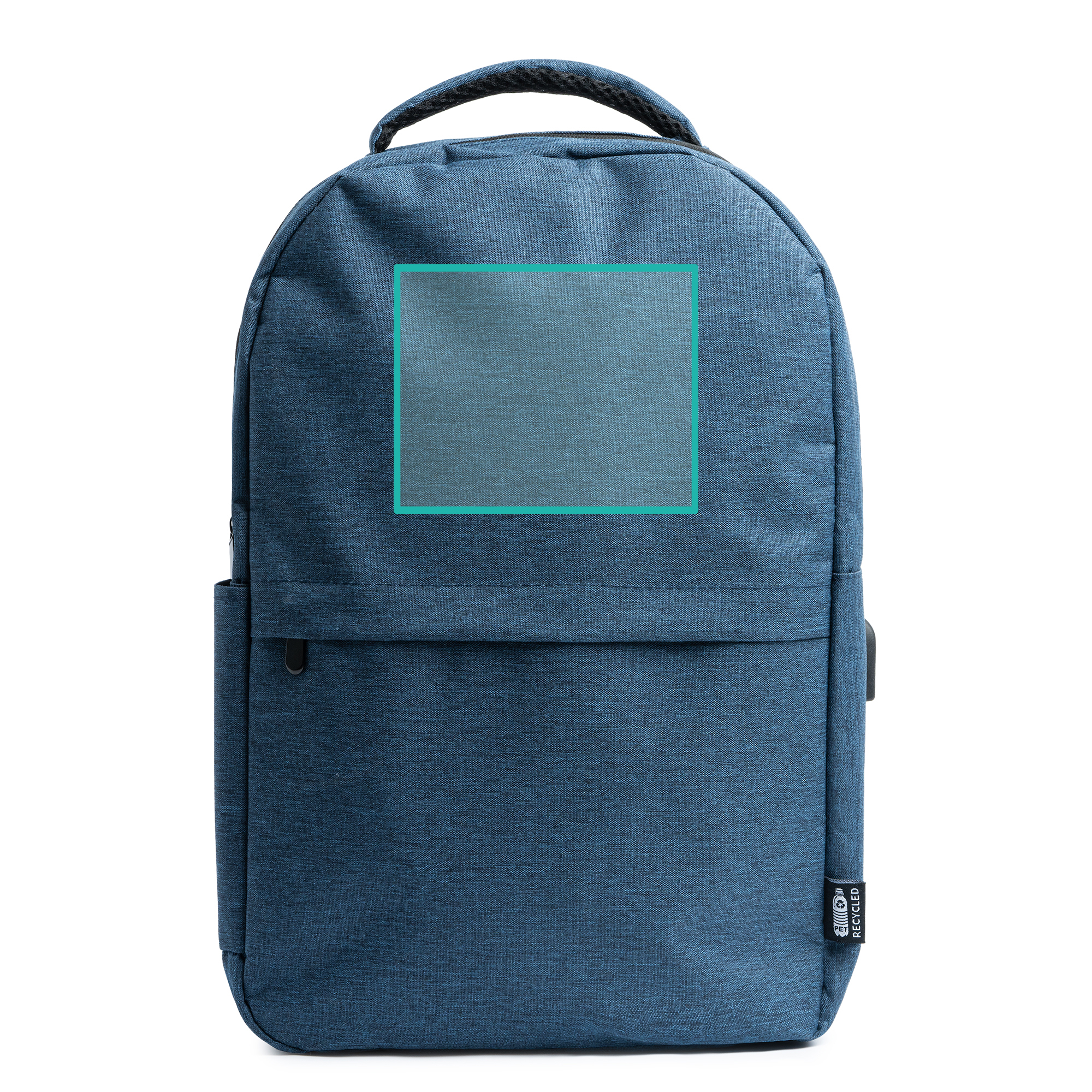 Mochila de poliéster reciclado RPET 600D con diseño vigoré. Bolsillo principal acolchado ideal para portátil o tablet. Salida USB para conectar un power bank (no incluido). Bolsillo frontal y lateral. Tiras y espalda acolchadas.