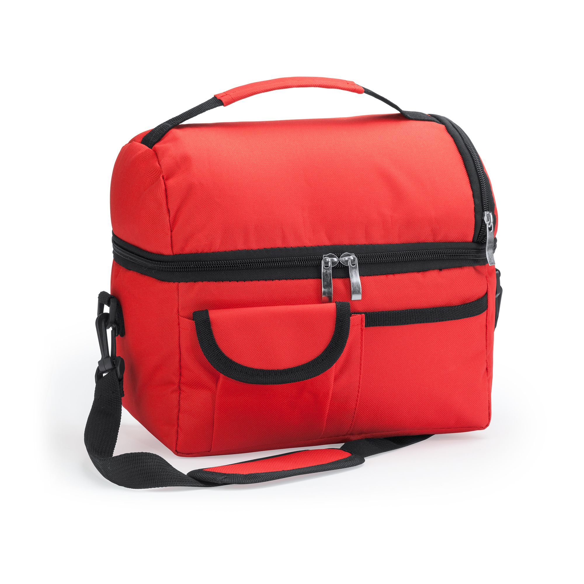Nevera multiusos de poliéster 600D. Compartimentos interiores isotérmicos y prácticos bolsillos exteriores. Cinta bandolera ajustable acolchada con mosquetón. Idónea bolsa isotérmica para llevar la comida al trabajo.