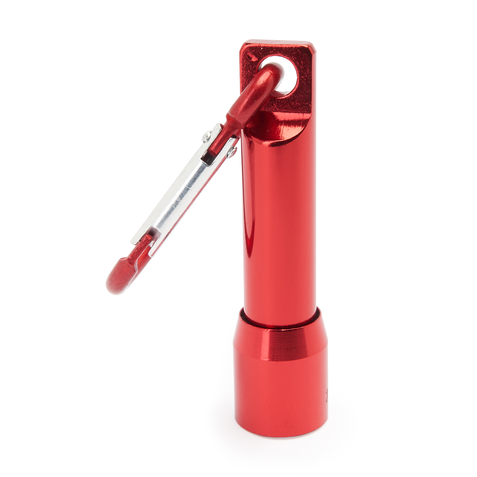 Linterna con 1 luz LED a pilas. Disponible en varios colores metalizados con mosquetón de transporte a juego.