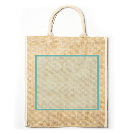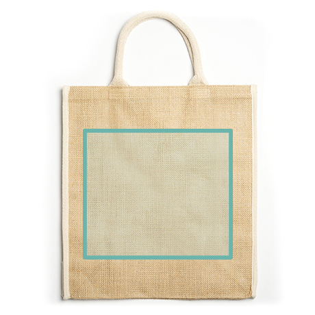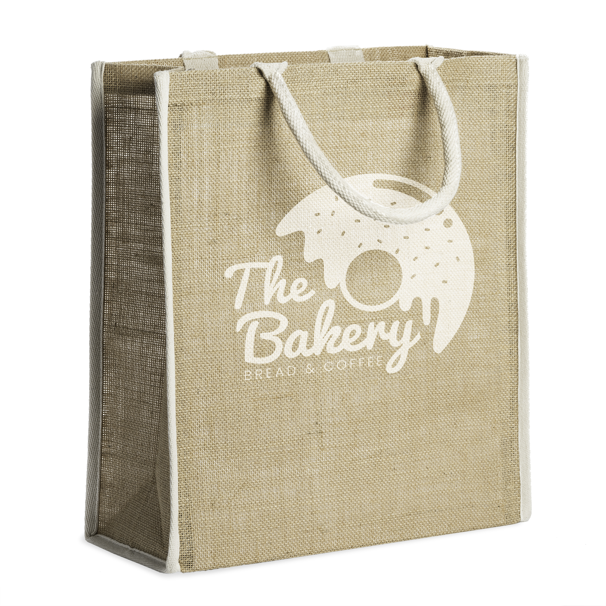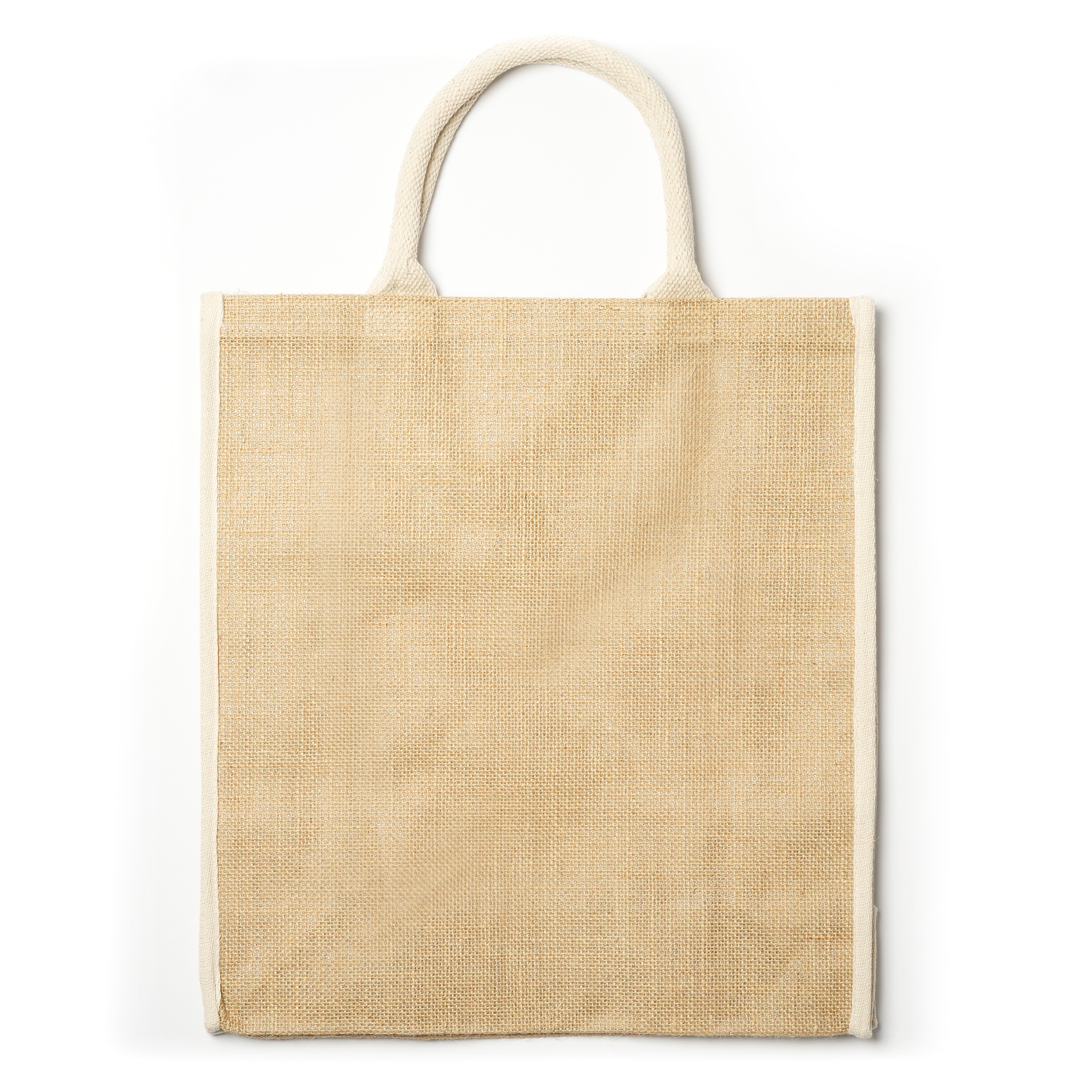Bolsa de yute natural laminado con ribetes y asas reforzadas de algodón. Acabado cosido.