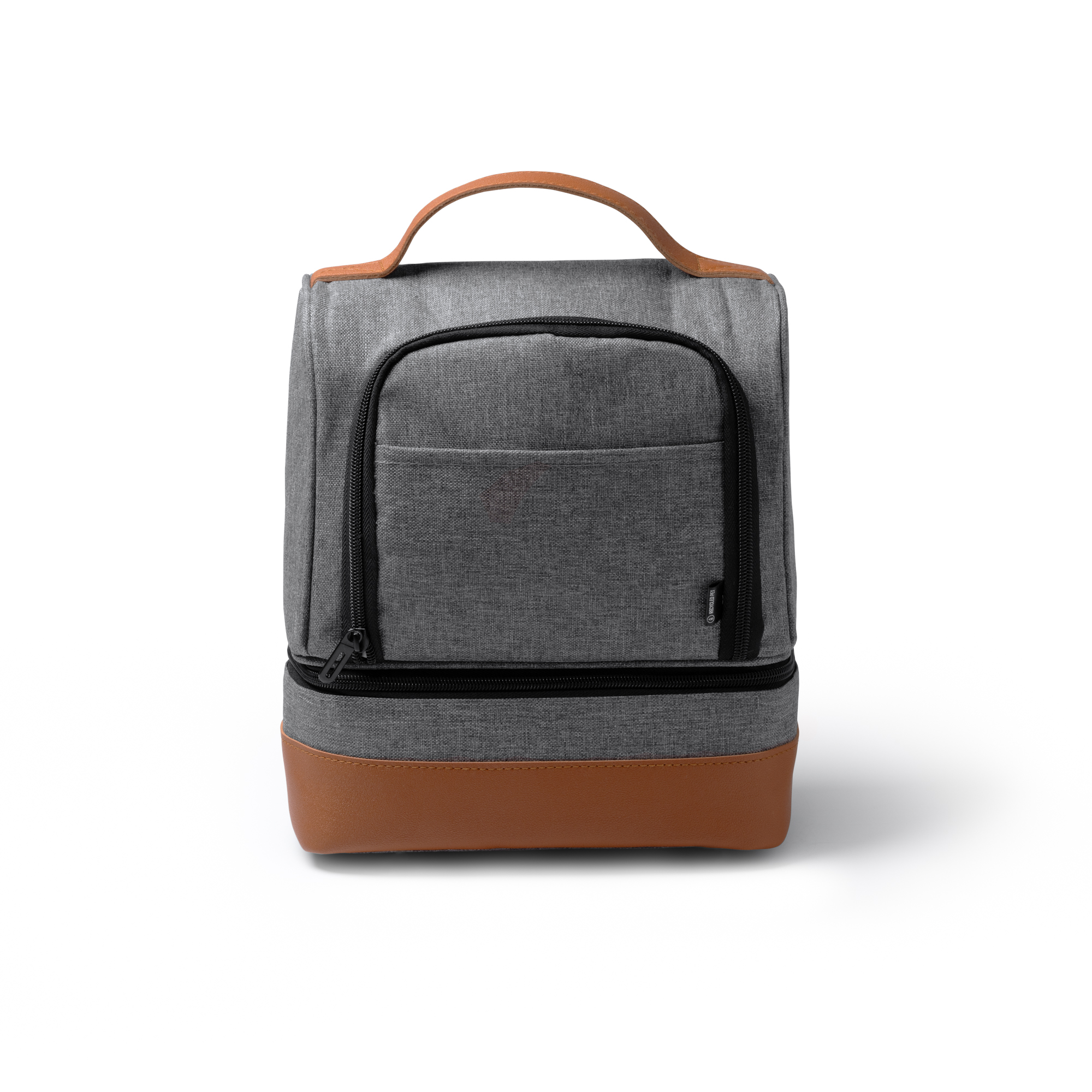 Nevera de políester reciclado RPET con diseño vigoré. Doble compartimento independientes con cierre de cremalleras y con interior isotérmico. Asas de transporte y base en PU Leather.