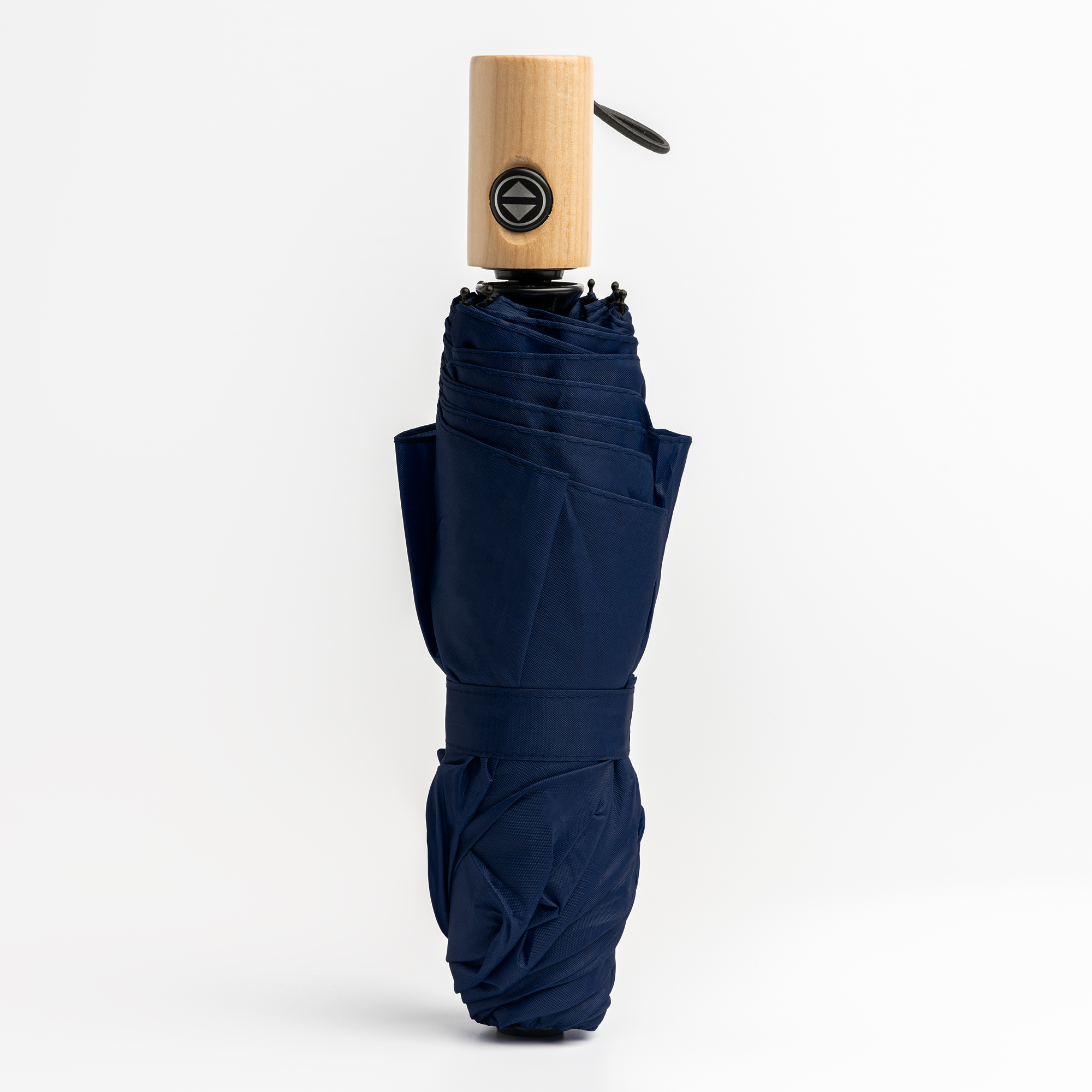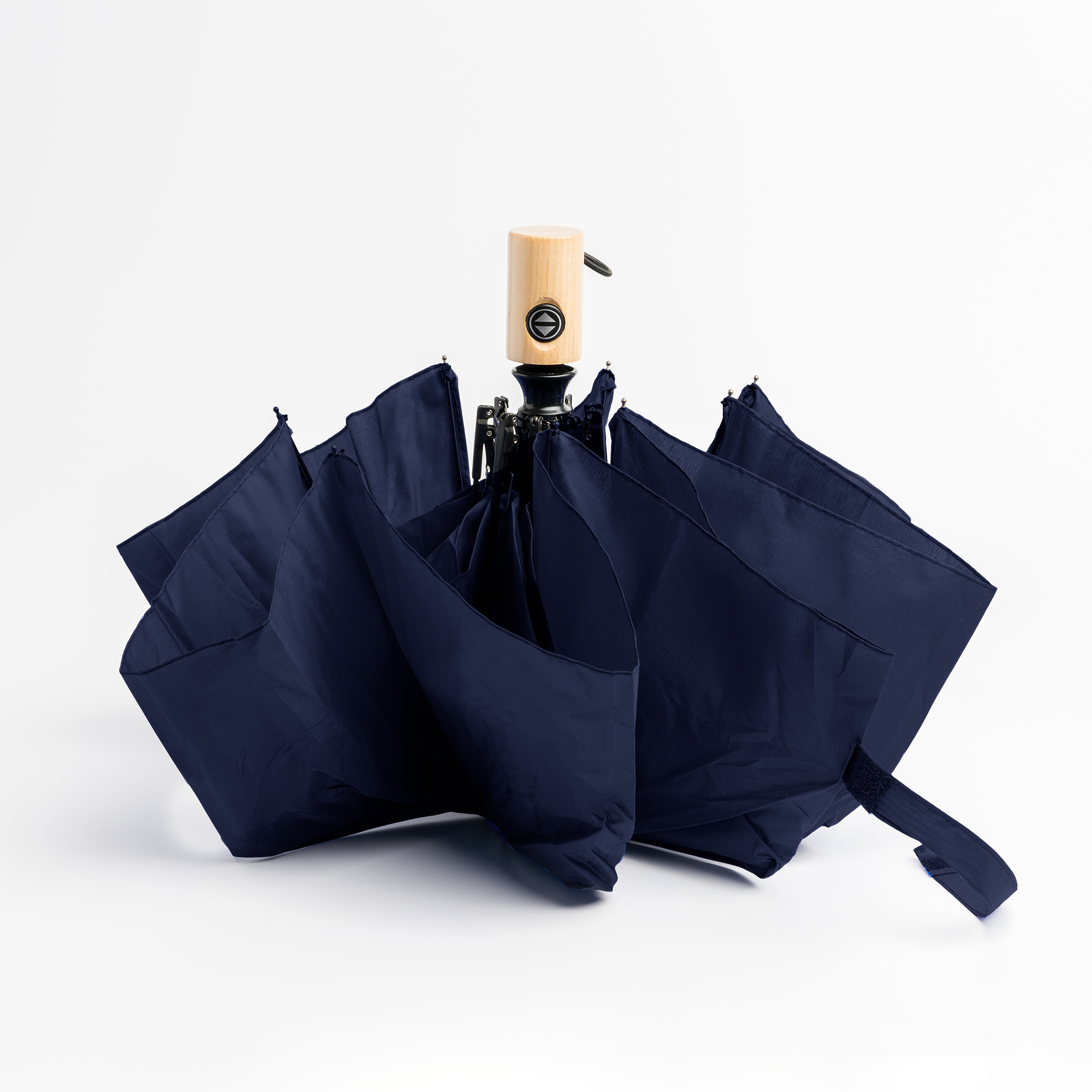 Paraguas de apertura y cierre automáticos. Tejido pongee 190T con funda a juego. Varillas de fibra de vidrio y terminaciones en negro con mango de madera. Cierre con velcro a juego. Un paraguas antiventisca idóneo para los días de tormenta.