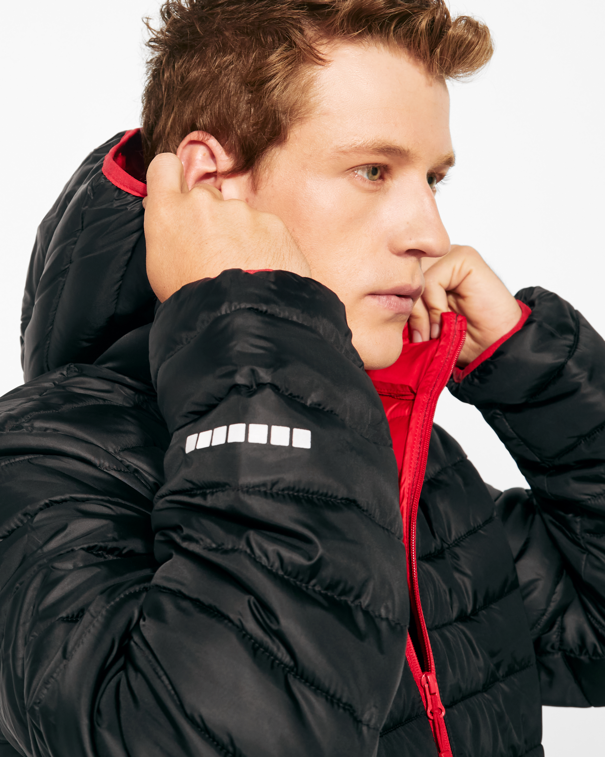 ·Cremallera frontal invertida a contraste con protector de barbilla y tirador.