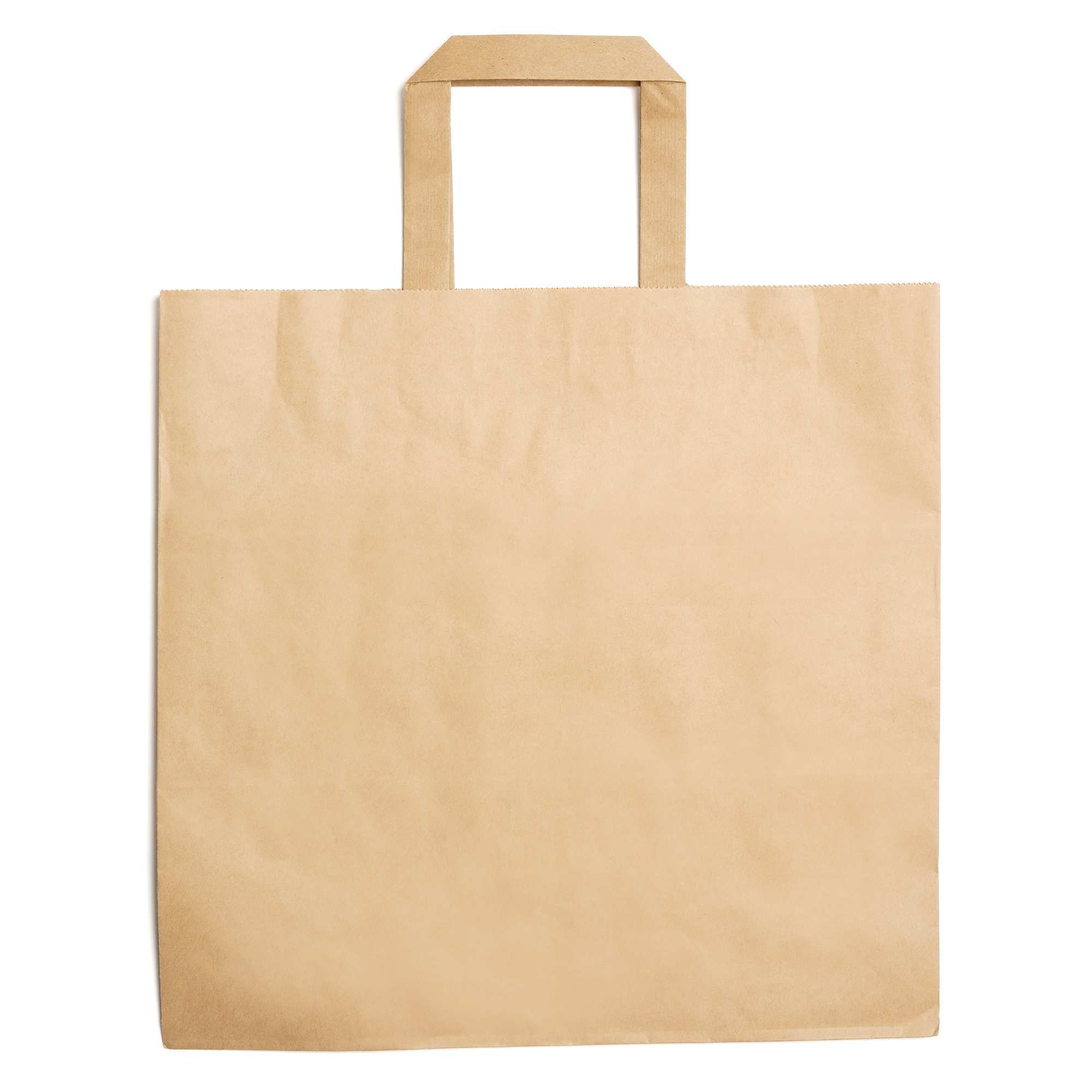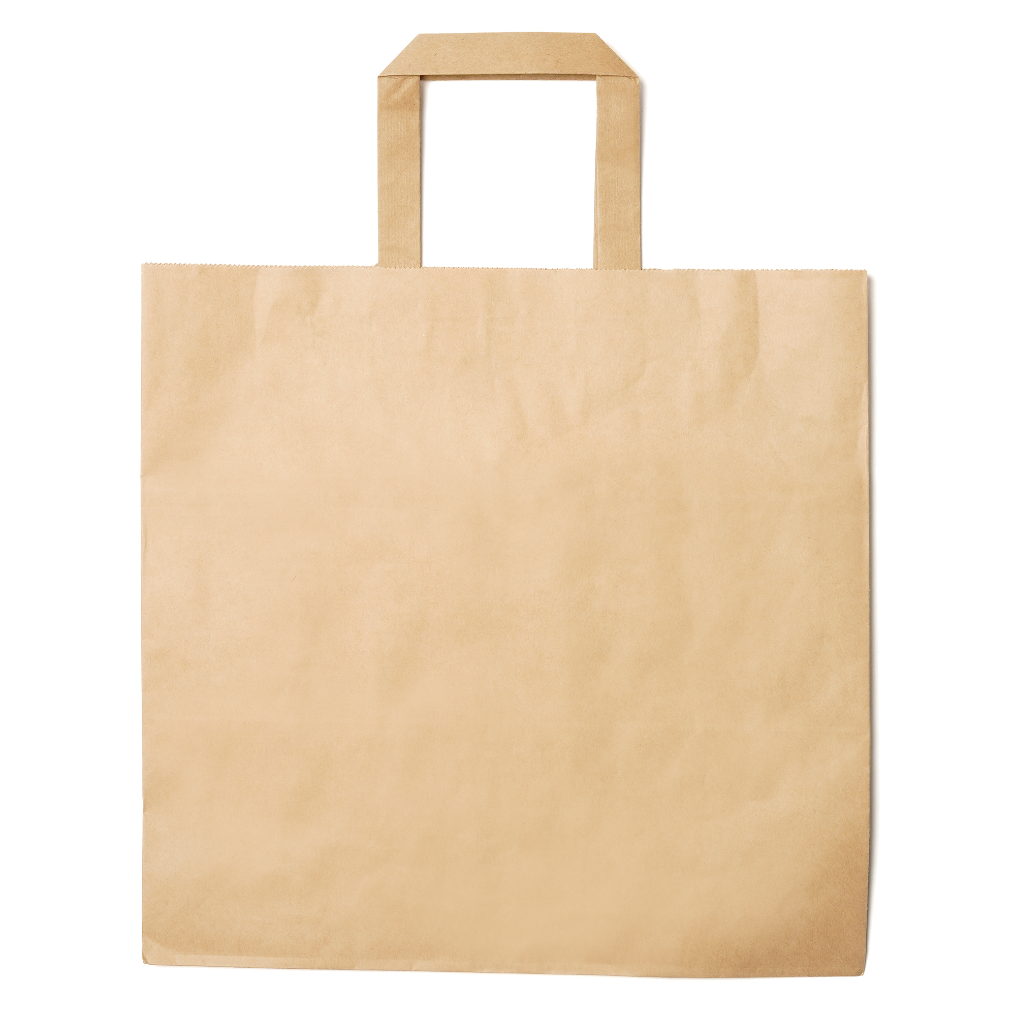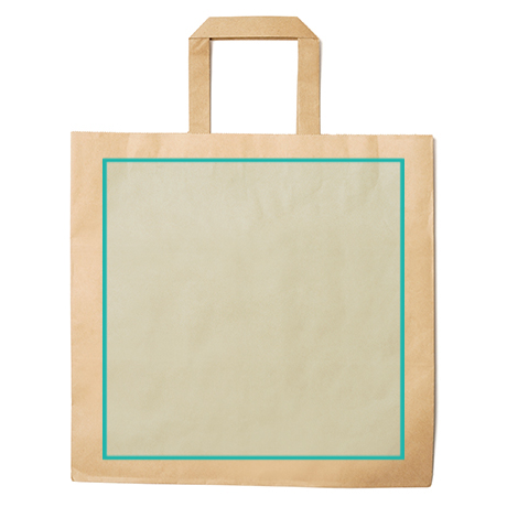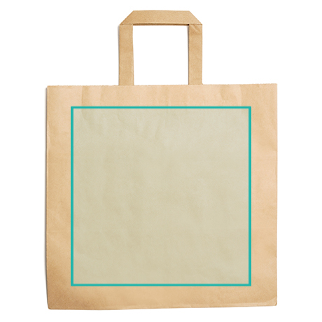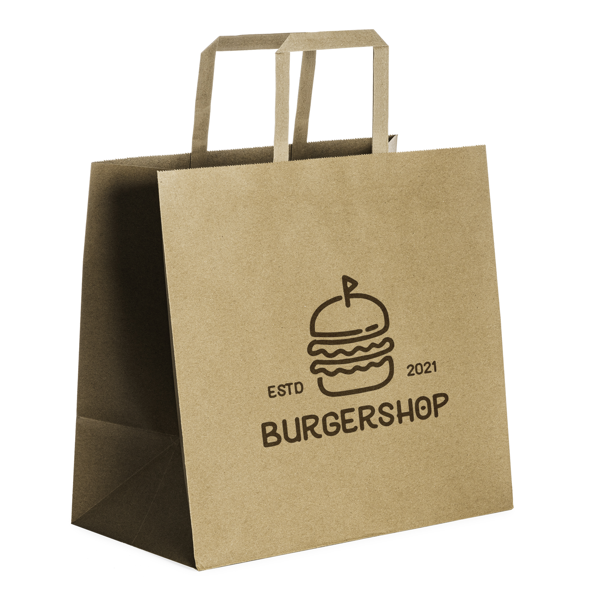 Bolsa de papel de 80 g/m² en acabado natural. Asas cortas reforzadas de diseño plano. Ideal para hostelería y restauración (take away).