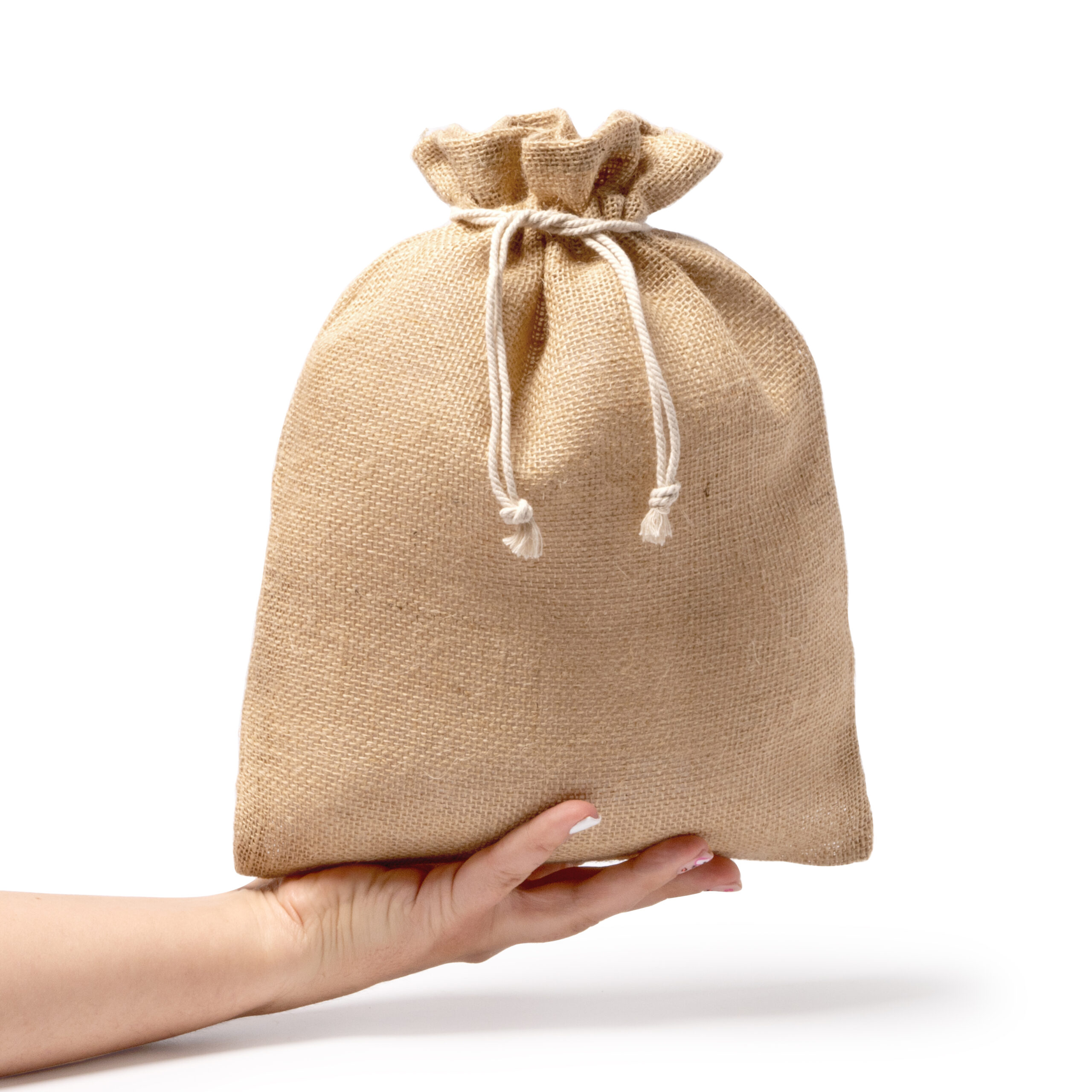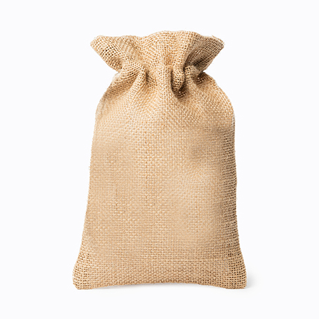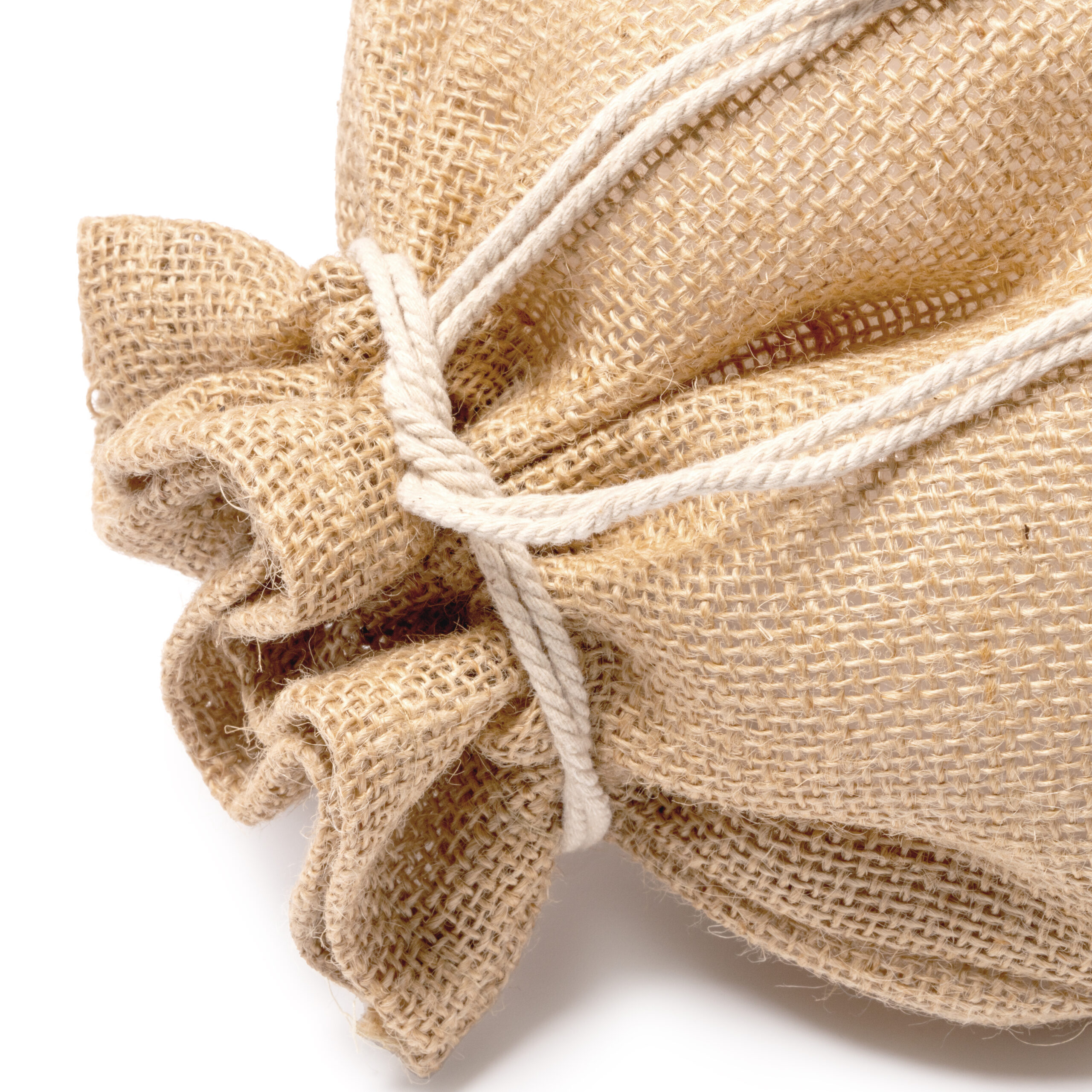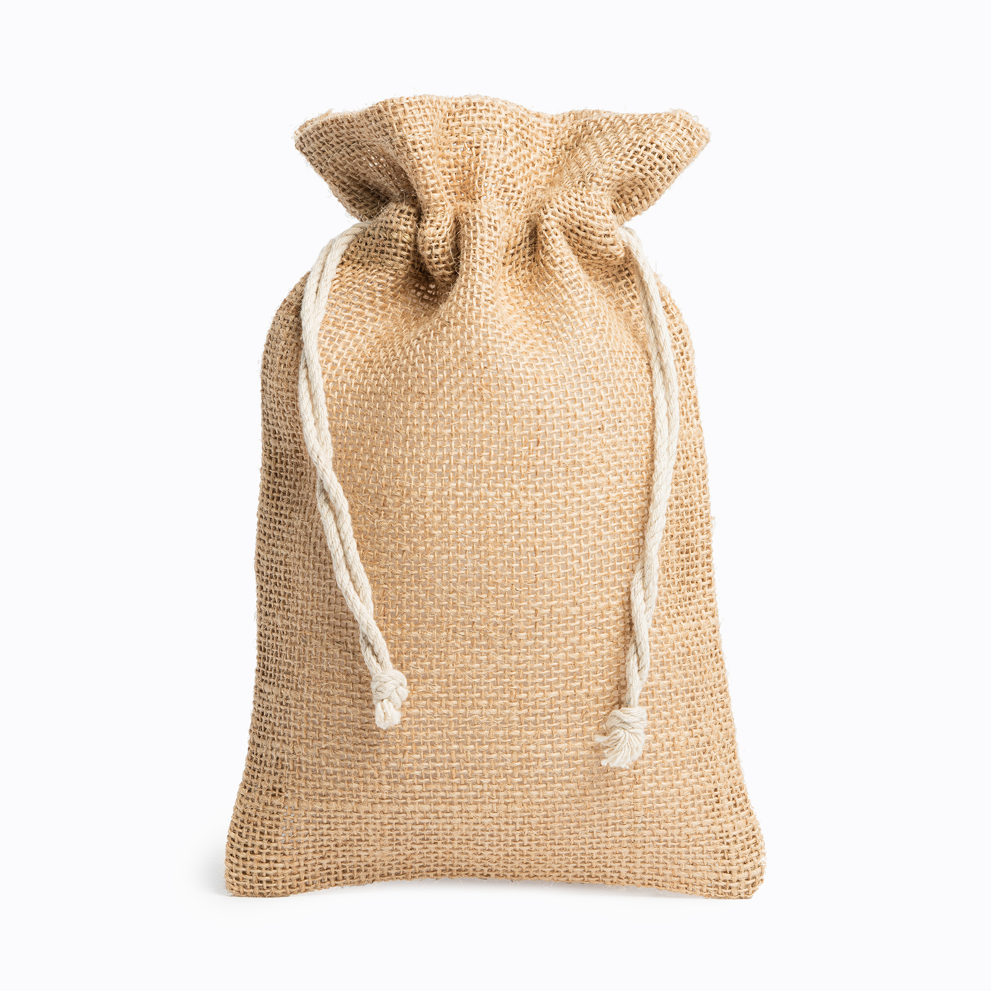 Bolsa estilo saco de yute natural. Cierre con cordones de algodón.