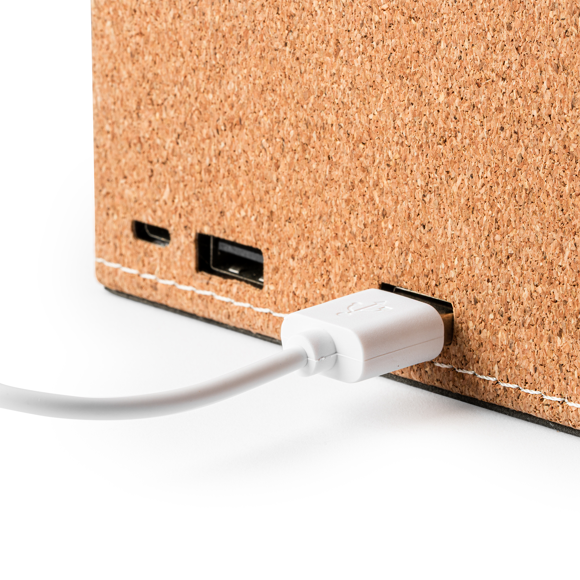Portalápices con cargador inalámbrico integrado. Realizado en corcho natural. Incluye 2 puertos USB adicionales en la parte trasera, con una potencia de 5W. Cable incluido.