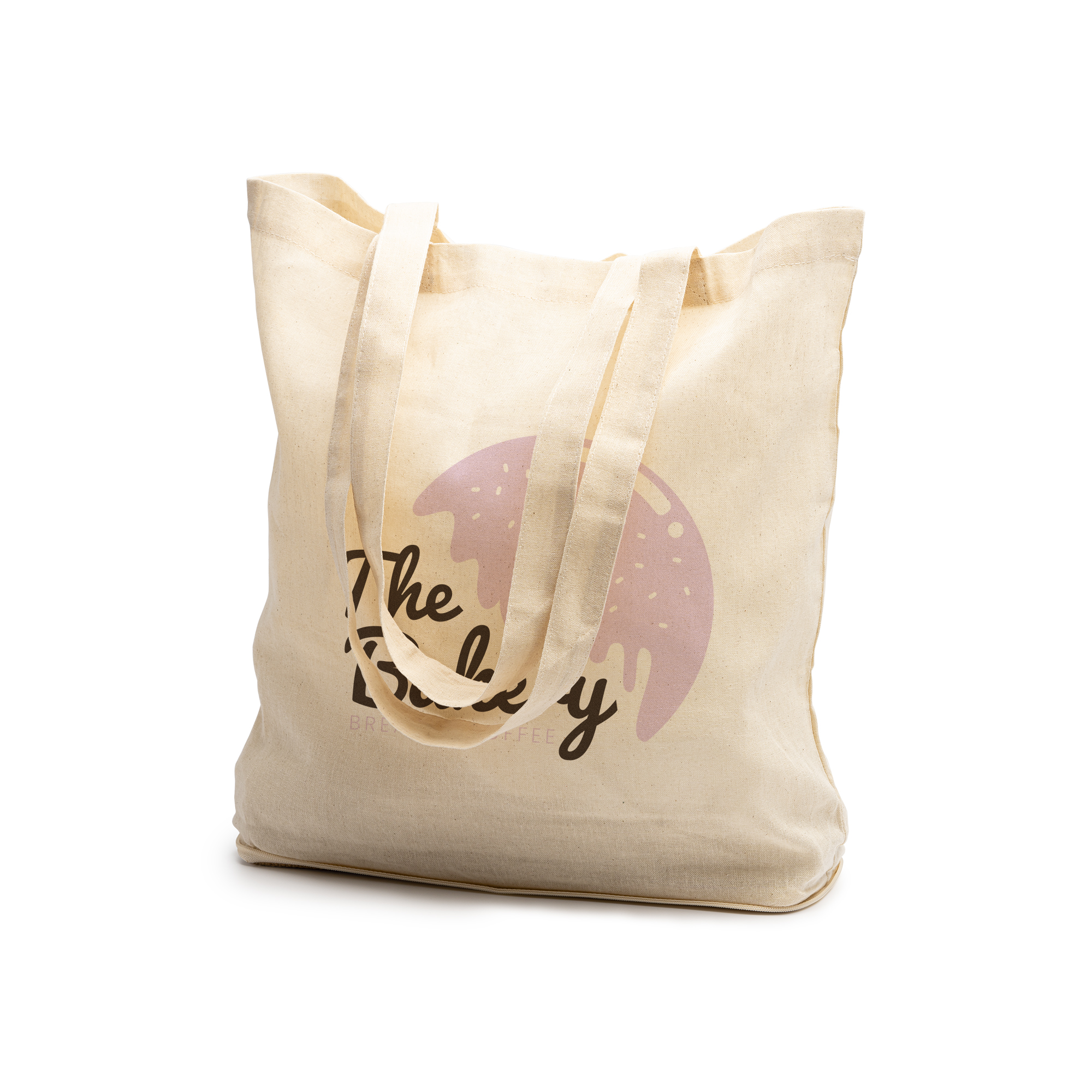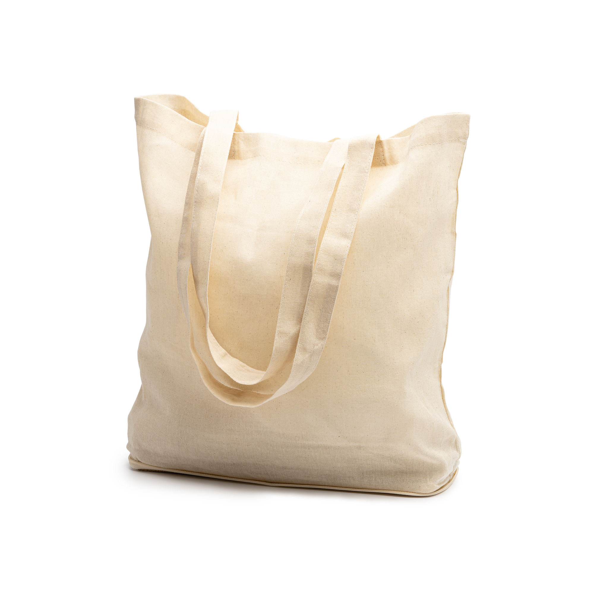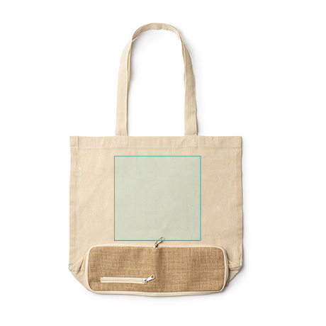 Bolsa plegable 100% algodón de 110 g/m² con base de yute. Incluye bolsillo exterior. Asas reforzadas de 60 cm. Fácil plegado y cierre de cremallera.