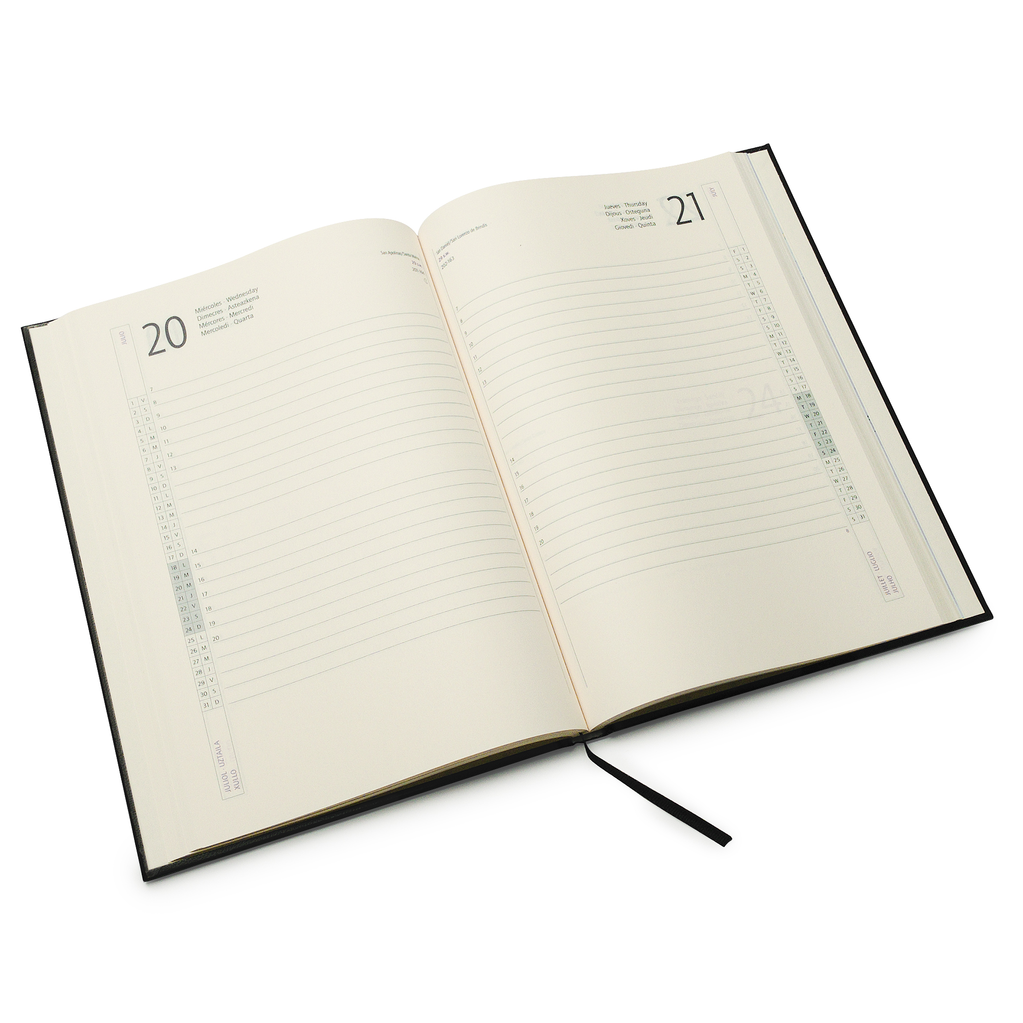 Agenda con cubierta de polipiel acolchada grabada en bajo relieve. 320 páginas en color beige más 4 páginas con mapas. Marcapáginas a juego con la cubierta. Gramaje del papel de 70gsm.