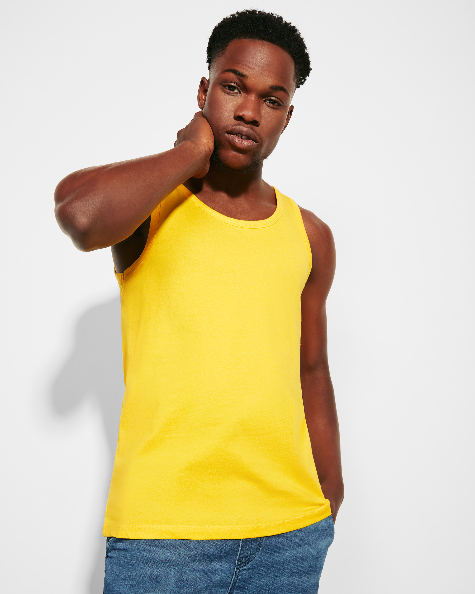 Camiseta de tirantes anchos, corte semientallado, ribeteado en punto liso en escote y sisa. Costuras laterales remalladas a 4 hilos dándole mayor durabilidad.