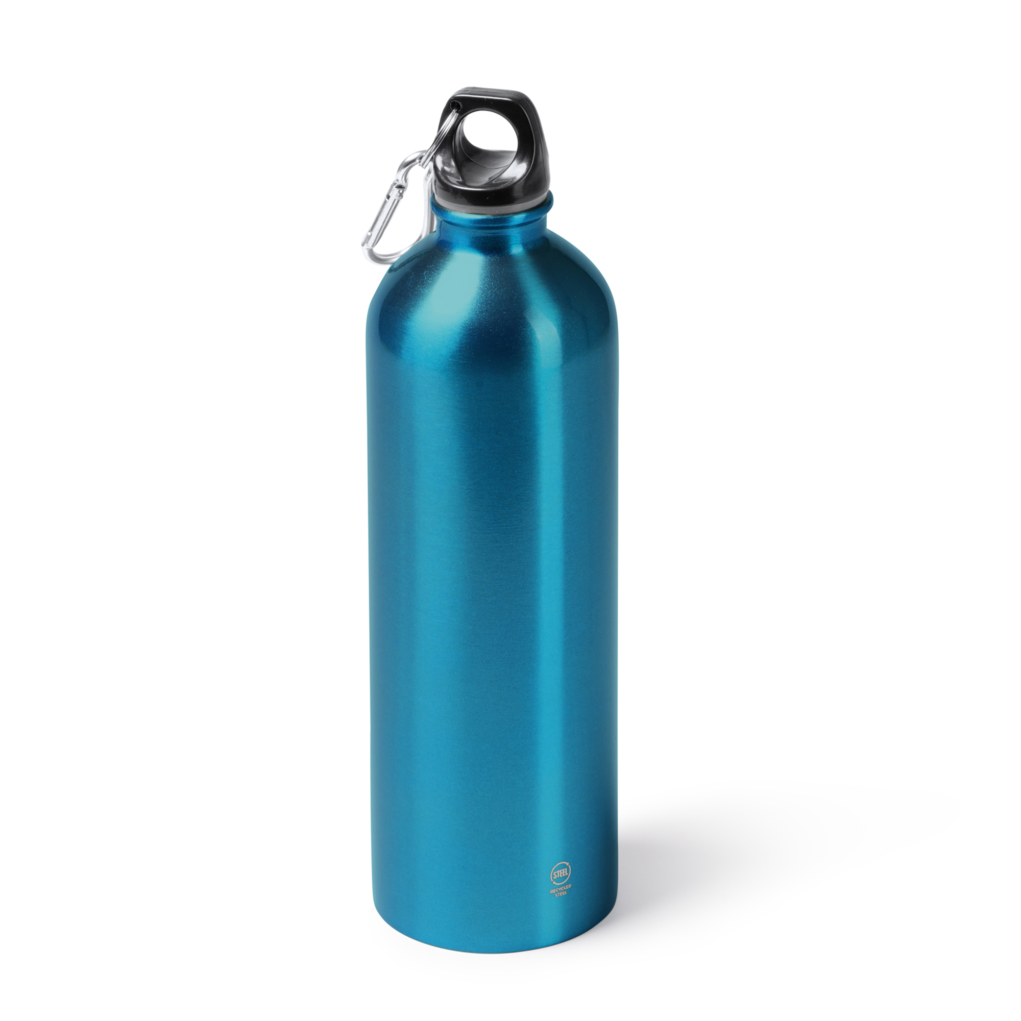 Bidón de acero inoxidable 304 reciclado. Con capacidad para 750 ml y acabado metalizado. Cuenta con tapón a rosca con silicona para evitar el goteo de las bebidas. Incorpora también un mosquetón en el tapón para hacer más fácil su transporte.