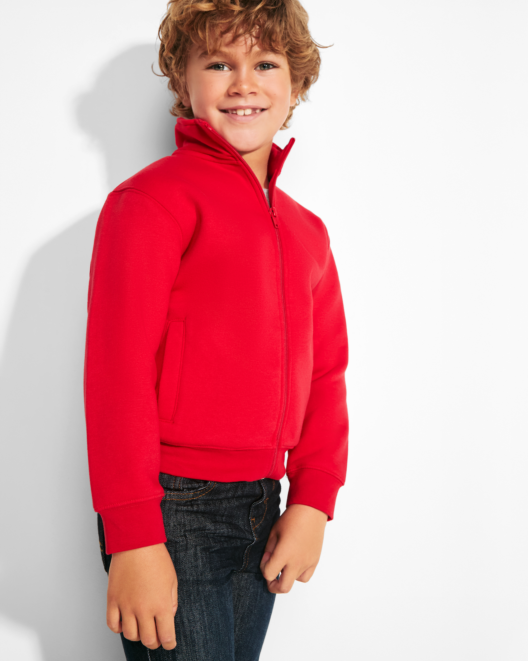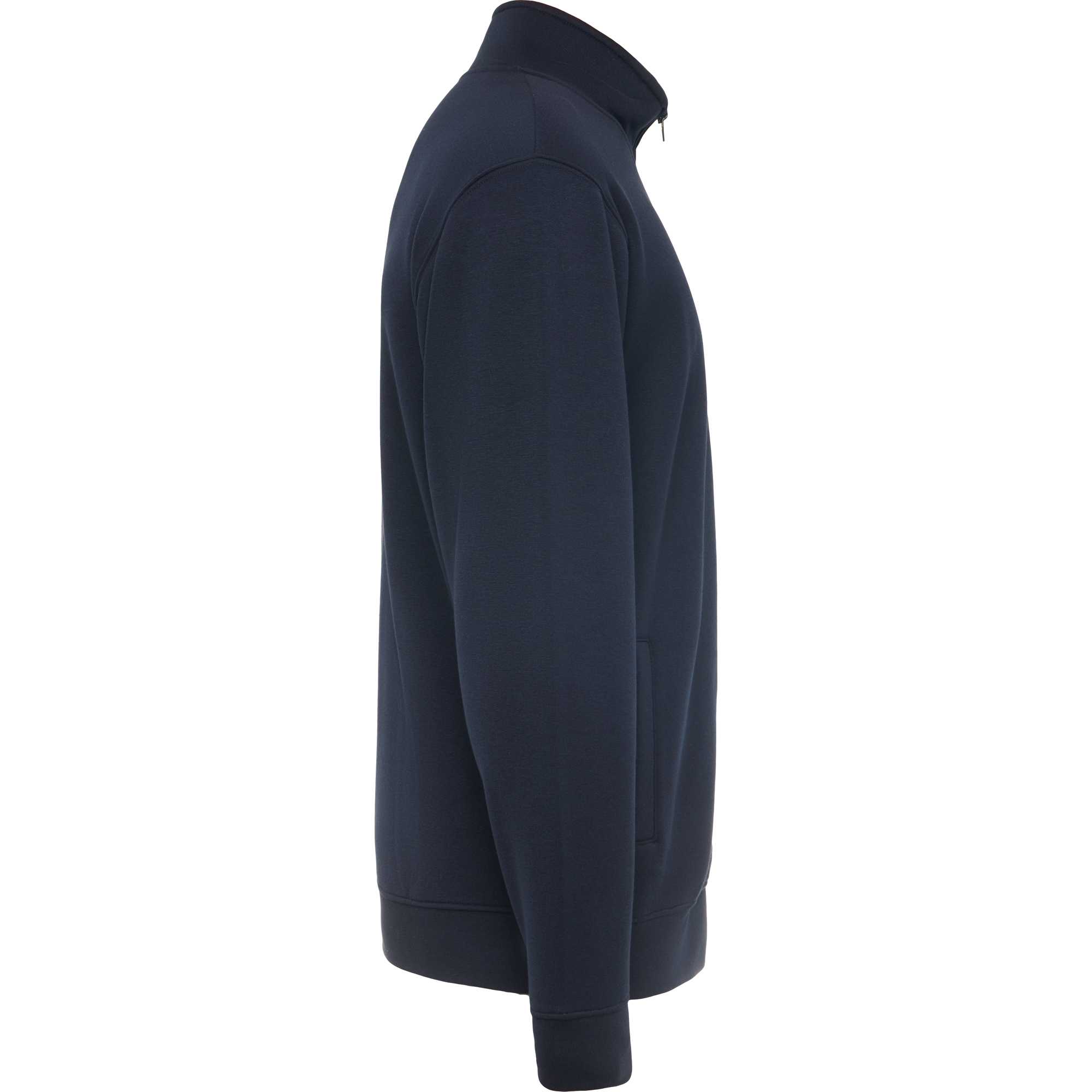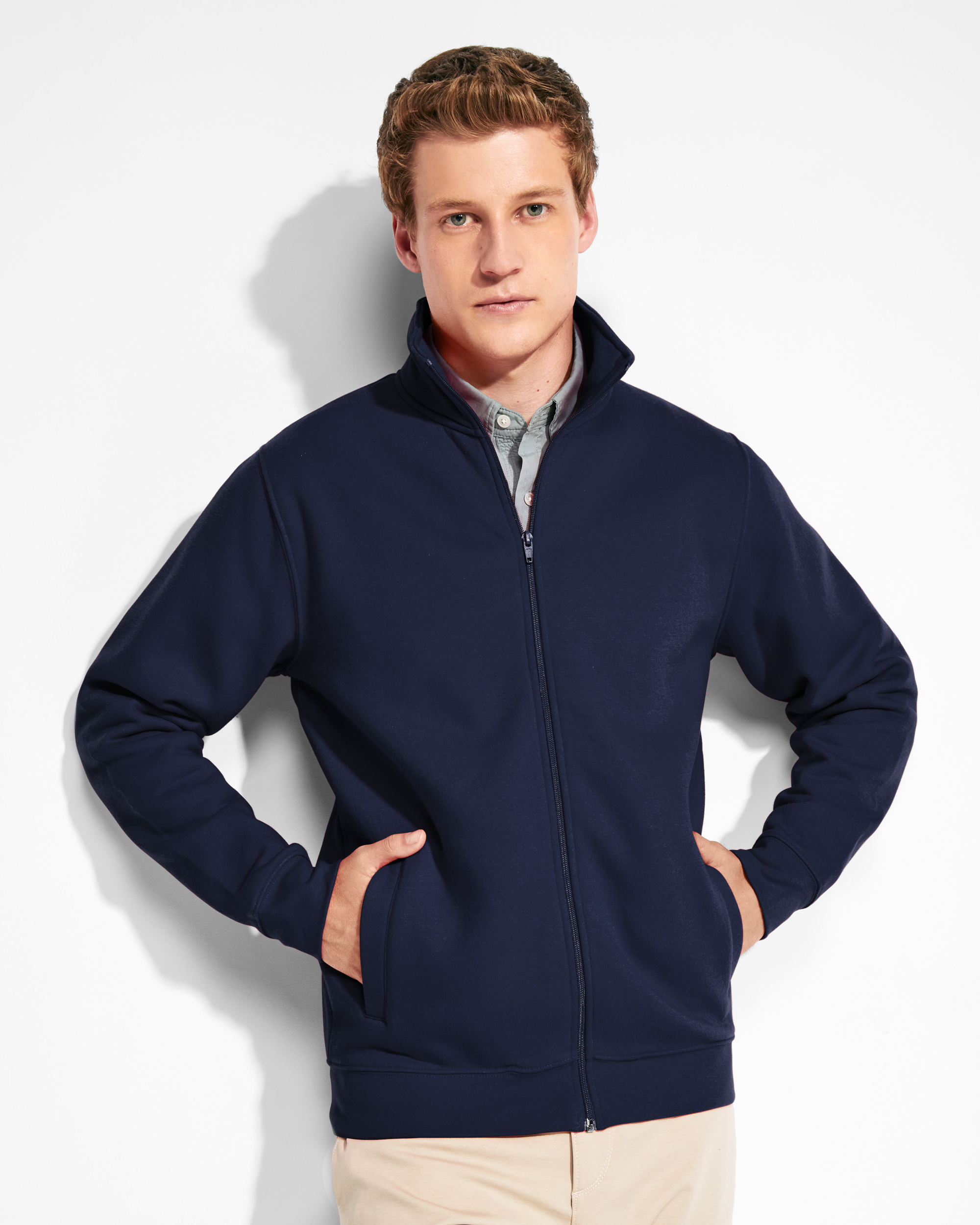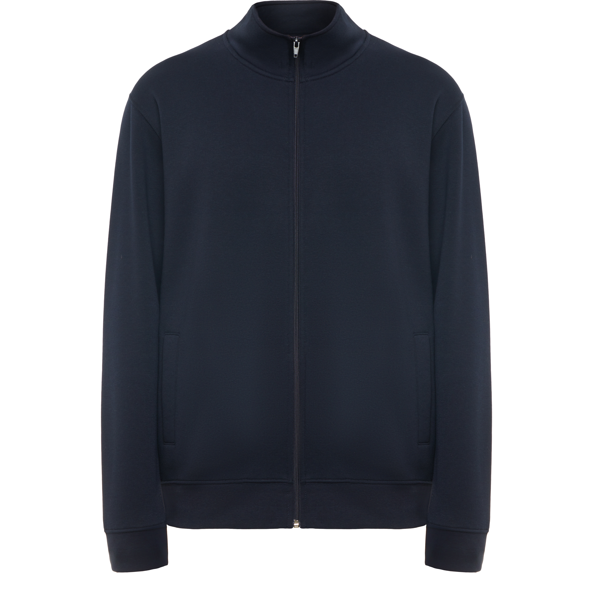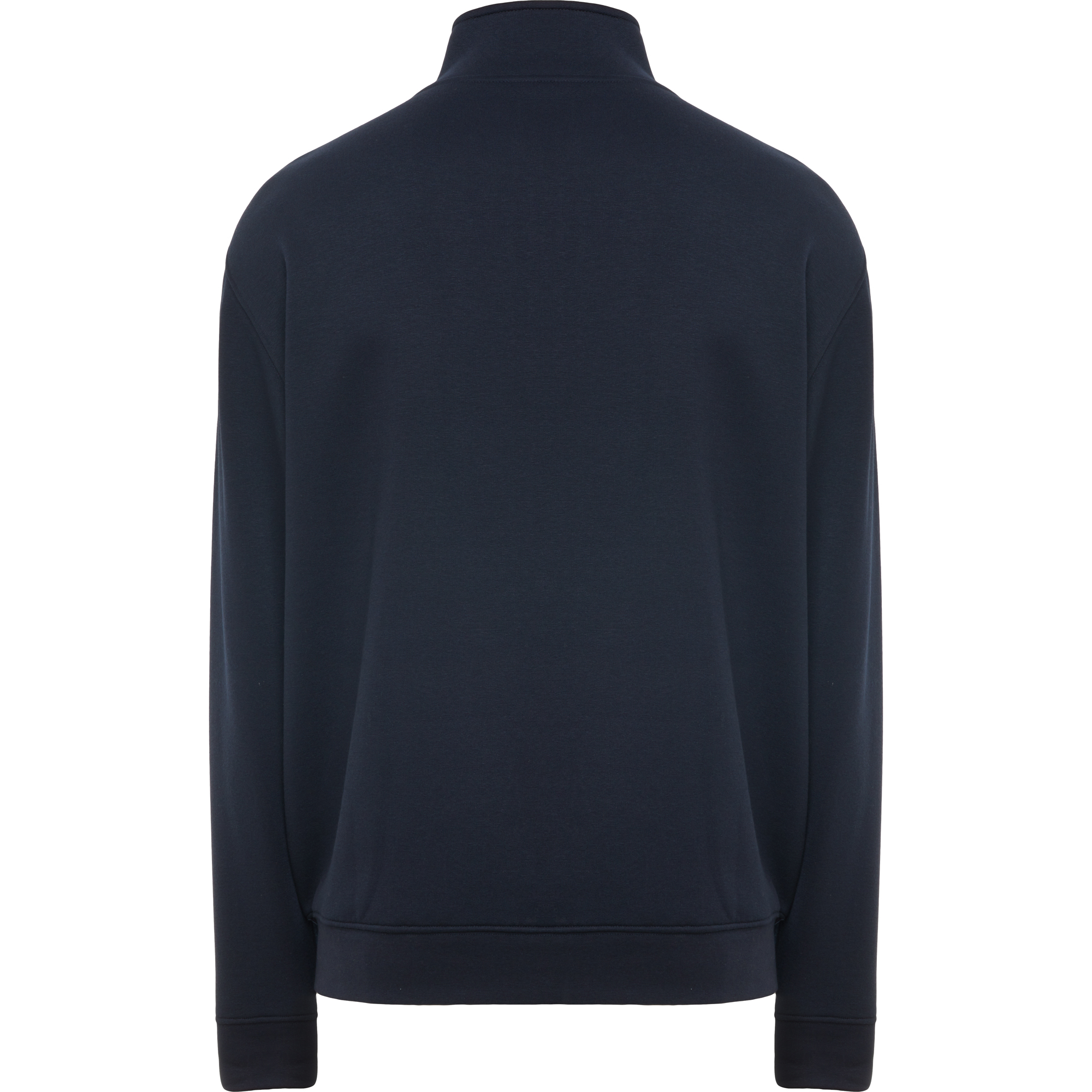 Sudadera de cuello alto con cremallera a tono. Vista interior del cuello en el mismo tono. Cubrecosturas reforzado en el interior del cuello. Punto canalé 1×1 en puños y cintura.