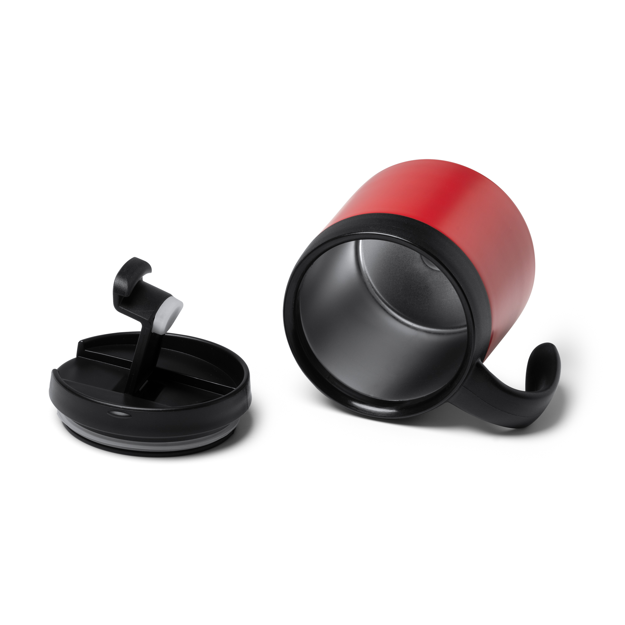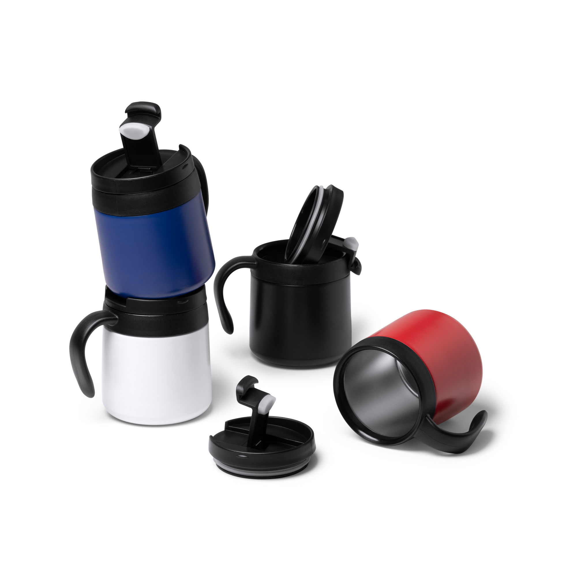 Taza de acero inoxidable 304 reciclado de doble pared con tapa a rosca y asa. Capacidad de 350 ml.