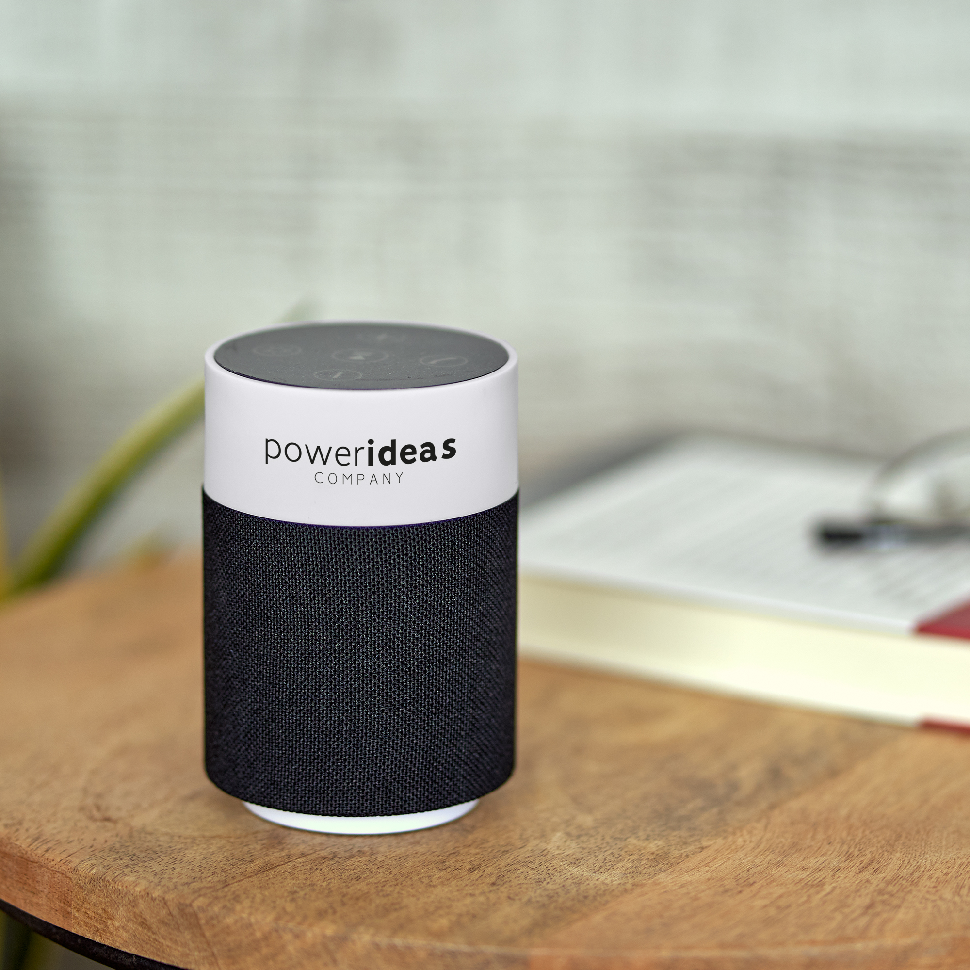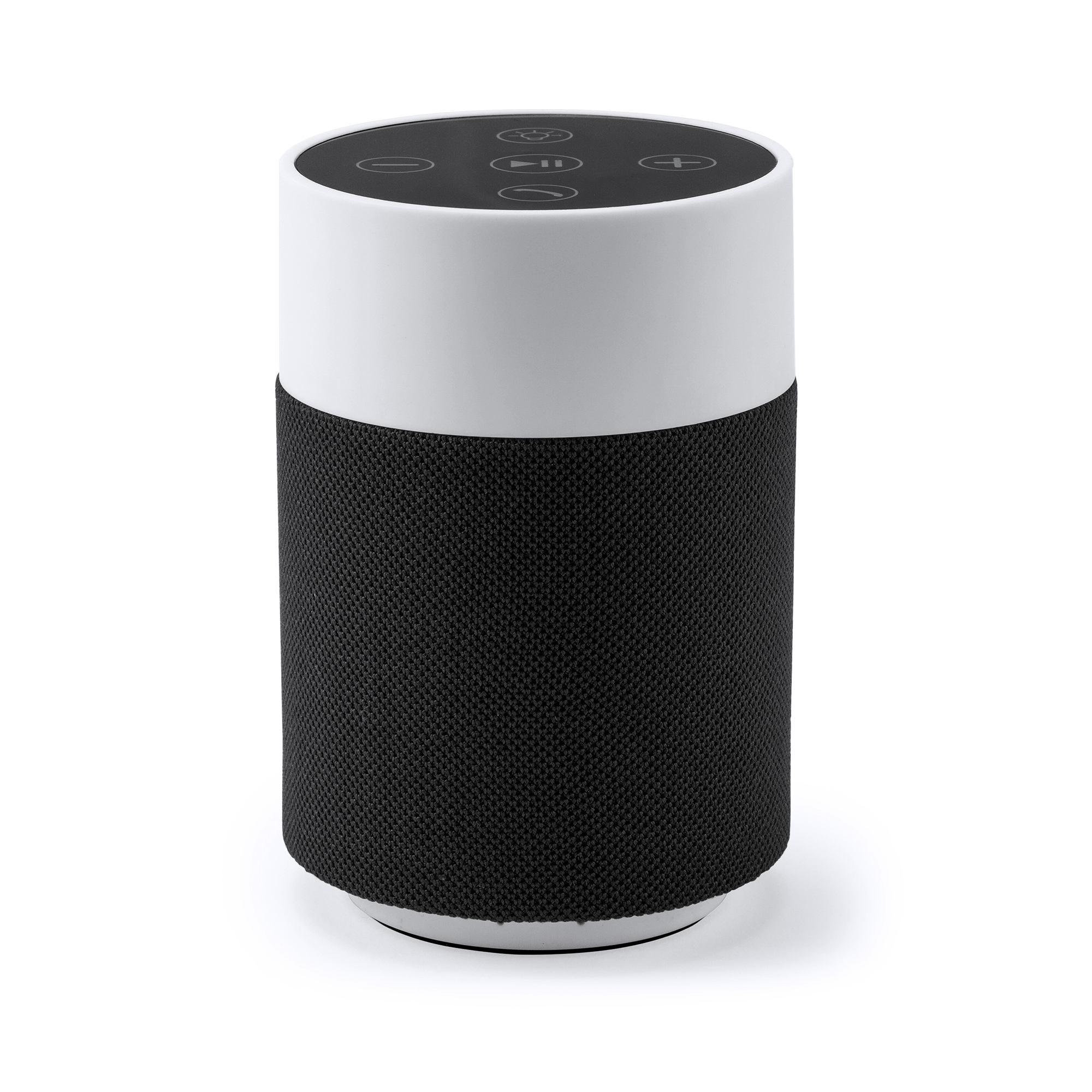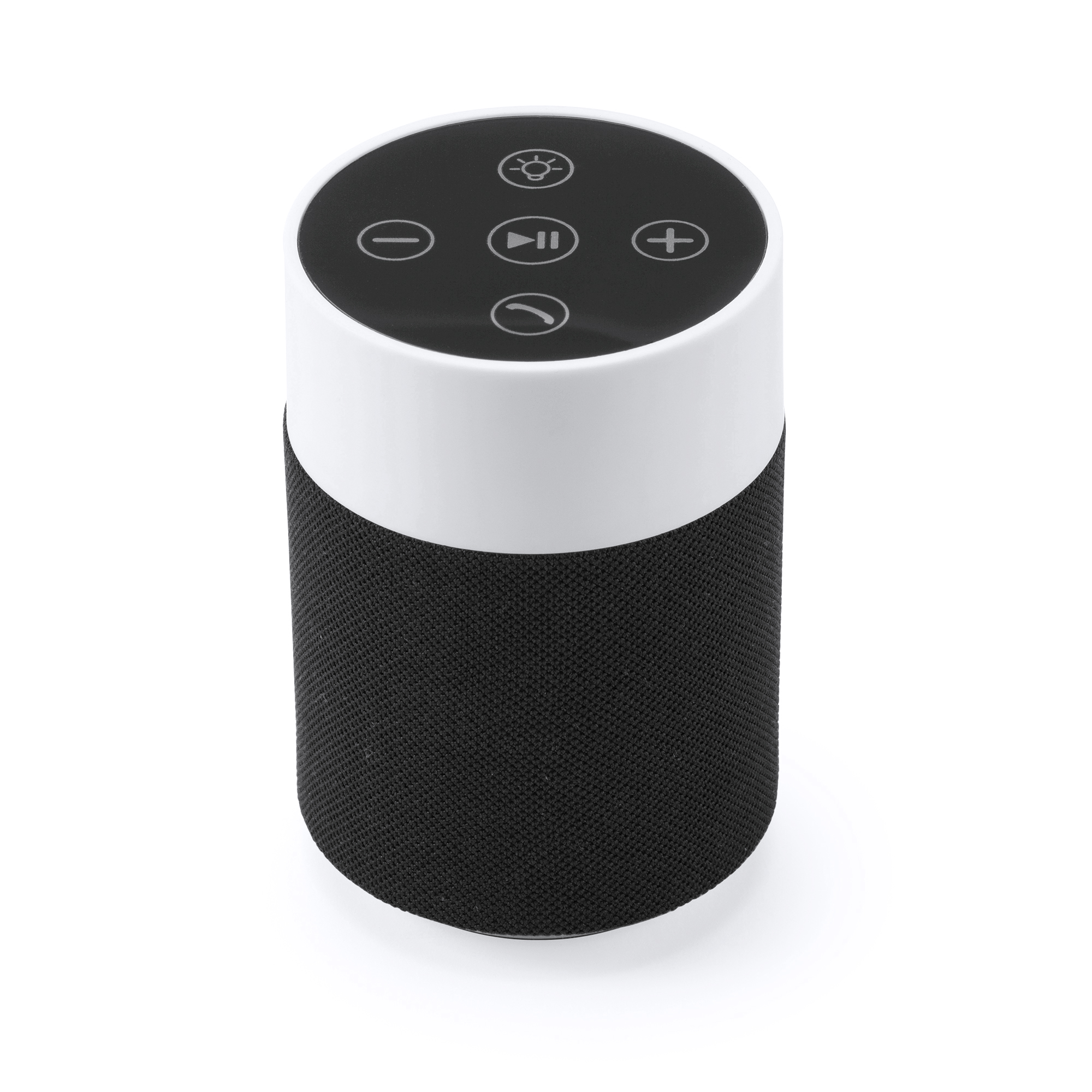 Estupendo altavoz inalámbrico Bluetooth 5.0, fabricado en acabado blanco con tacto goma. Combinación con tela a color. Panel de control táctil y luz LED multicolor en la base, con activación aleatoria a ritmo de la música. Función manos libres. Presenta 3W de potencia y batería recargable. Cable incluido.