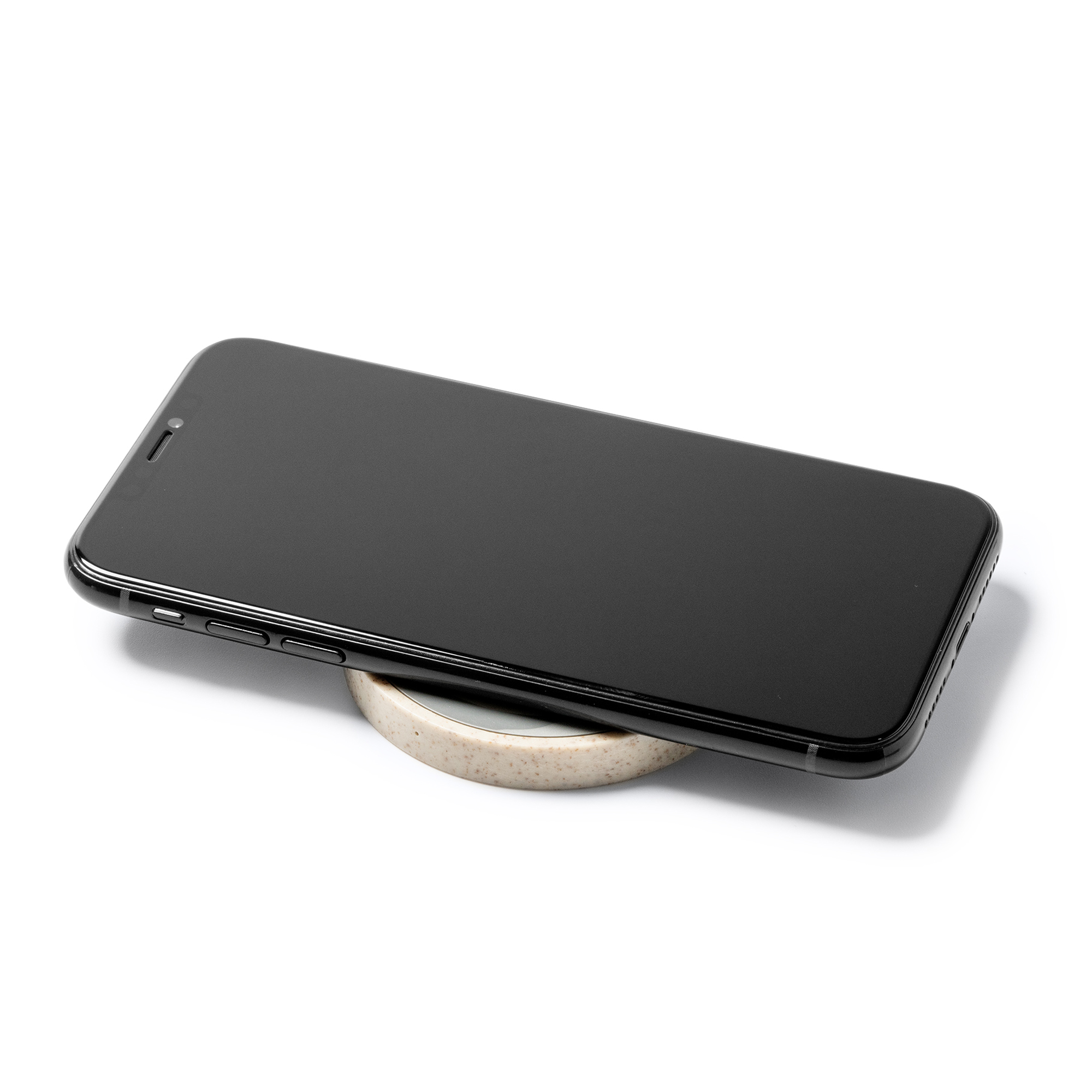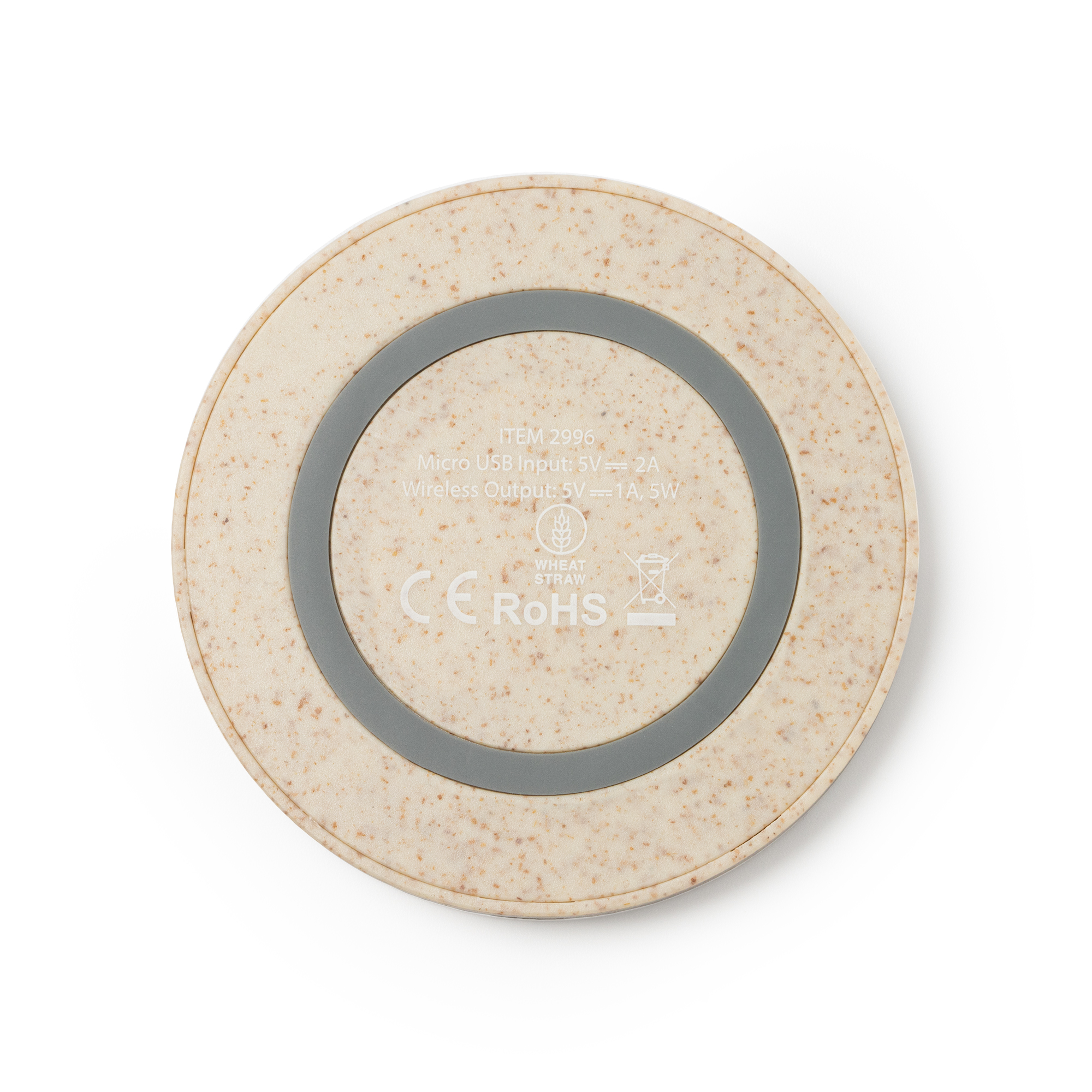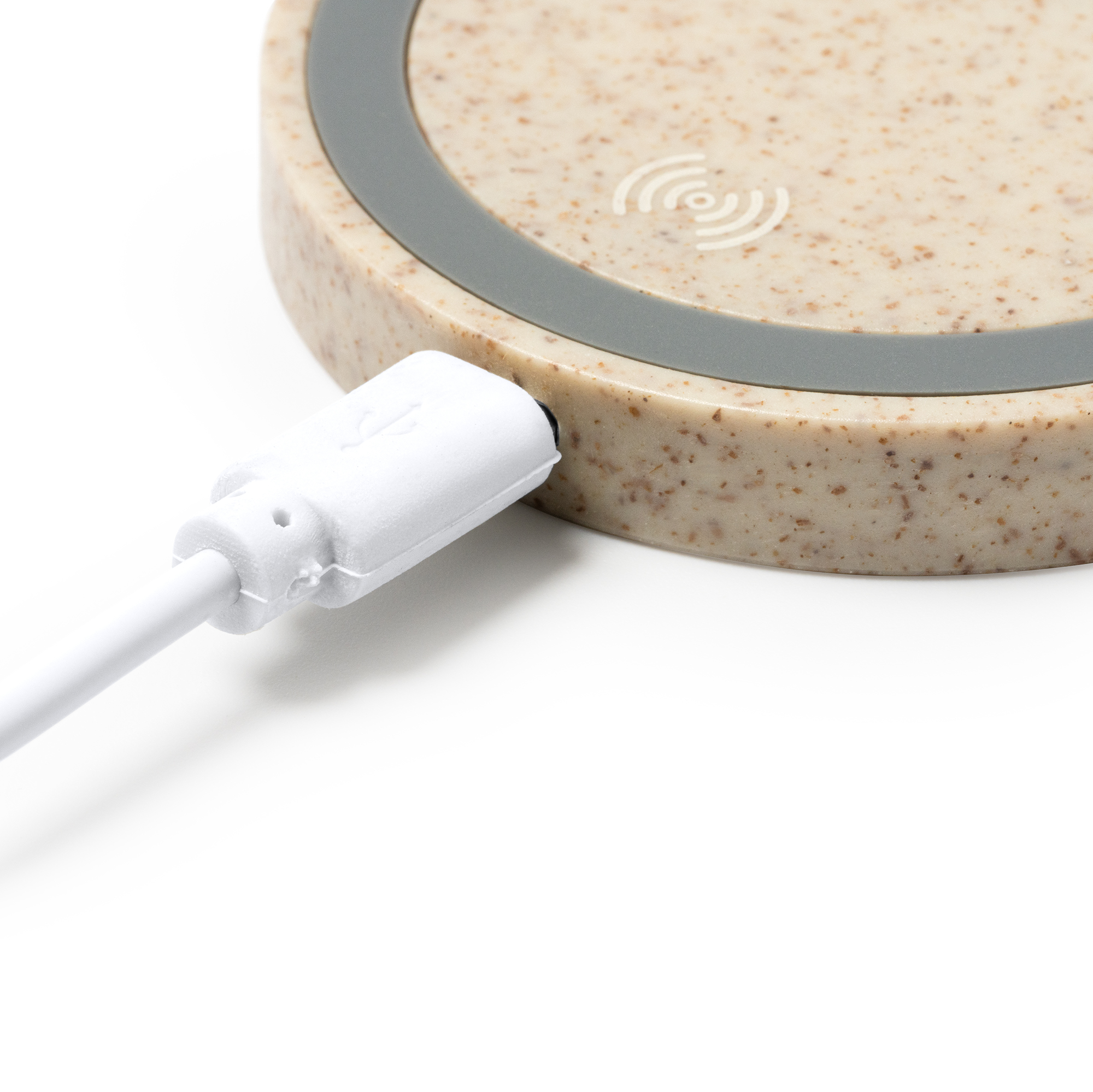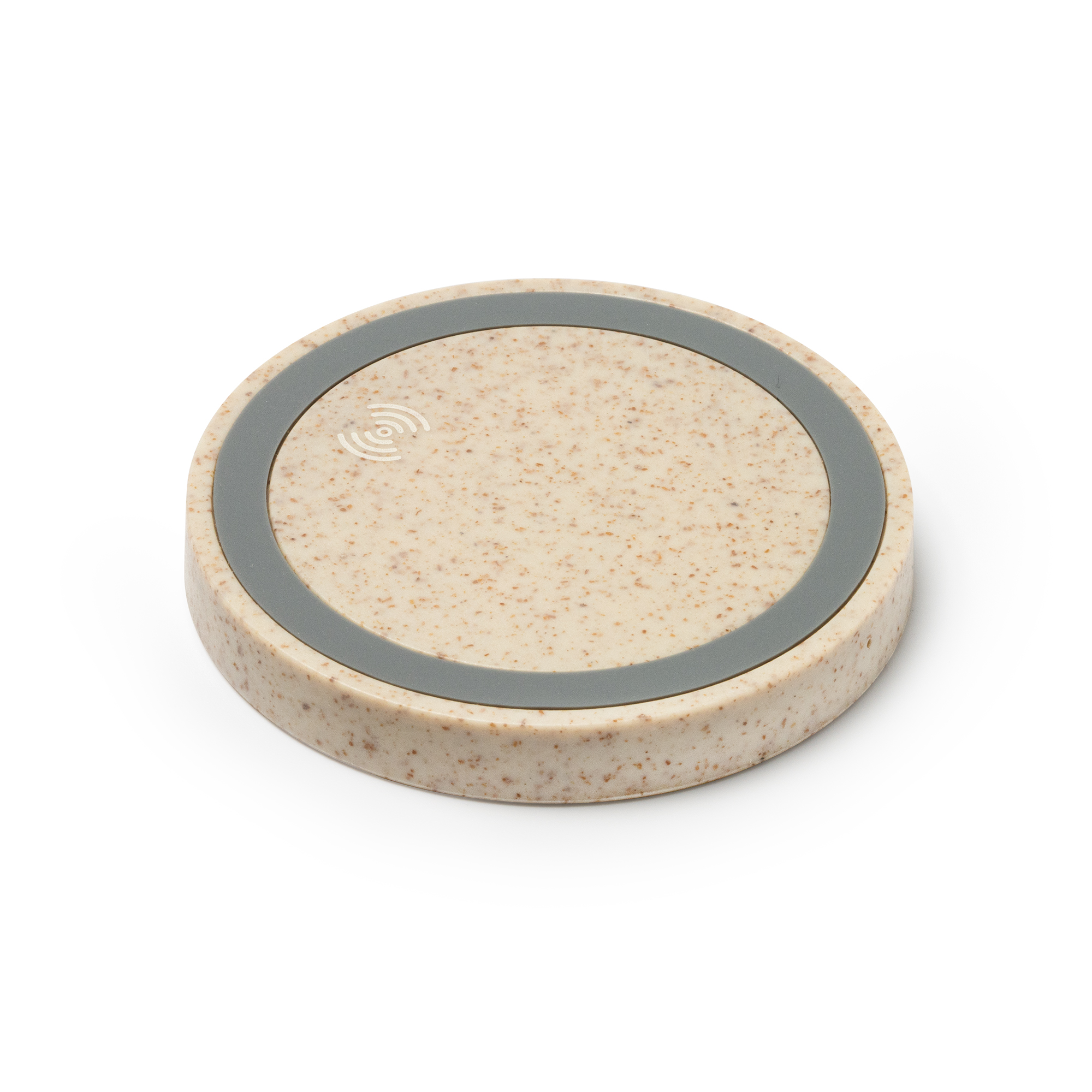 Base de carga inalámbrica realizada en fibra de trigo, con 5W de potencia. Compatible con dispositivos con tecnología de carga inalámbrica. Incluye cable micro USB.