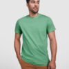 Camiseta gruesa de mujer en manga corta de algodón. Cuello redondo y ribete mangas en canalé ancho 2×1. Cubrecosturas reforzado en cuello. Costuras laterales. Logo Roly a tono en bajo lateral izquierdo. Costura ancha en el bajo.