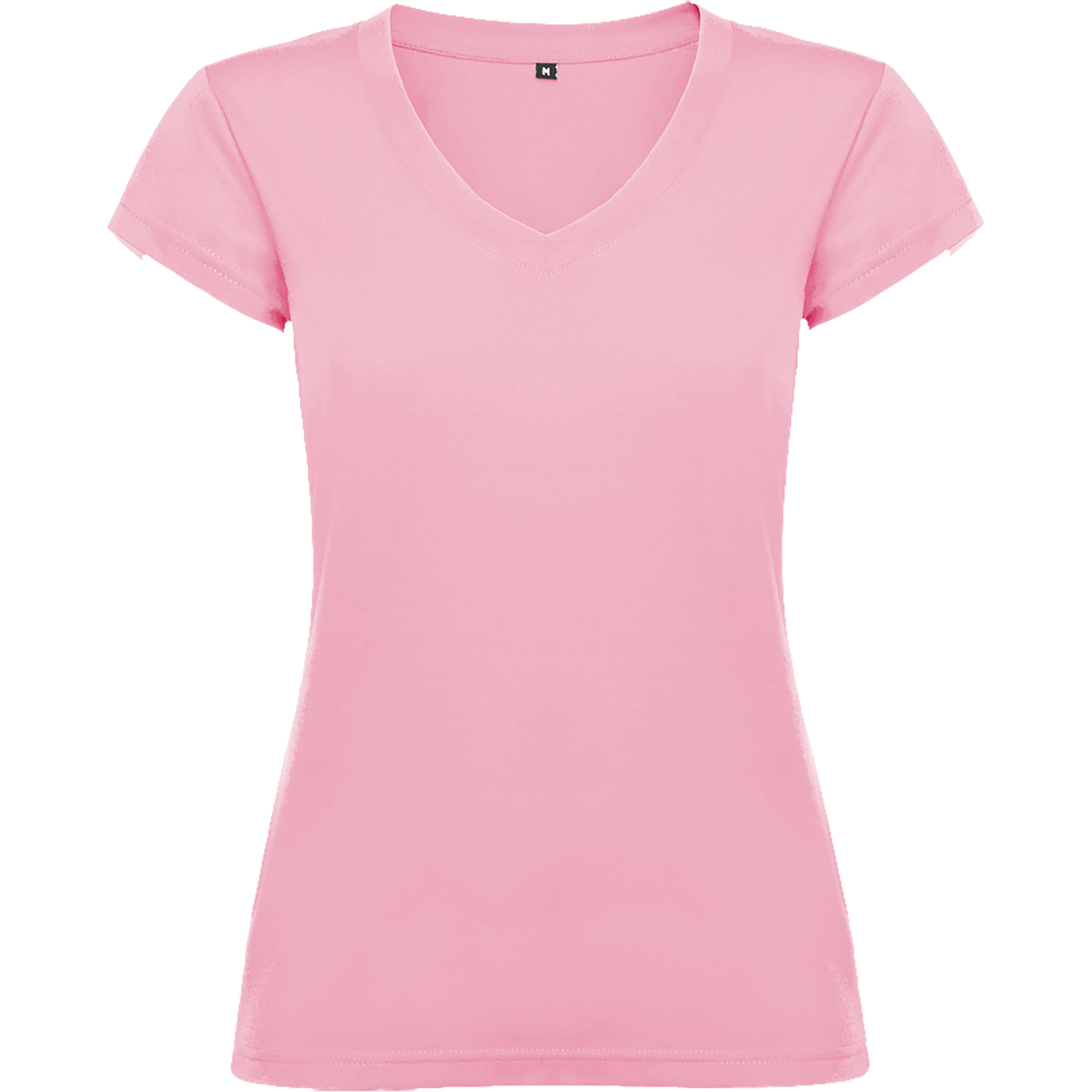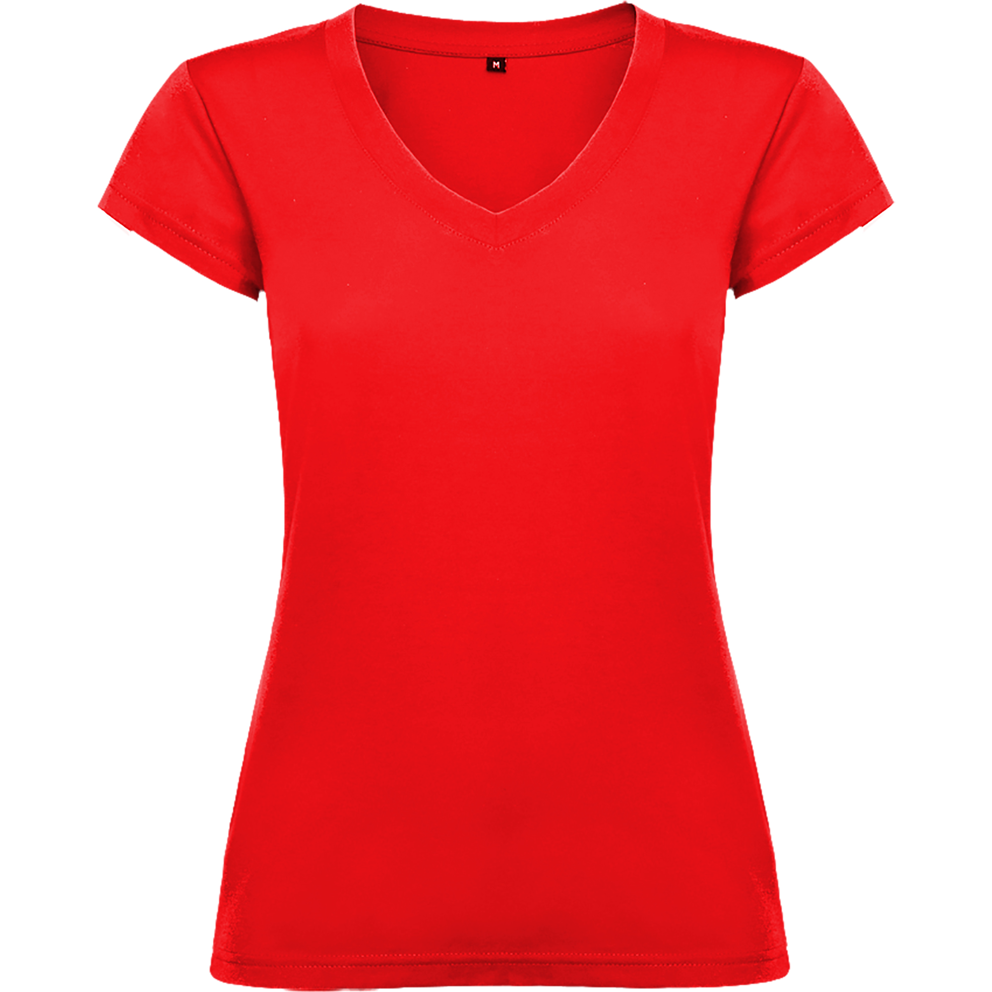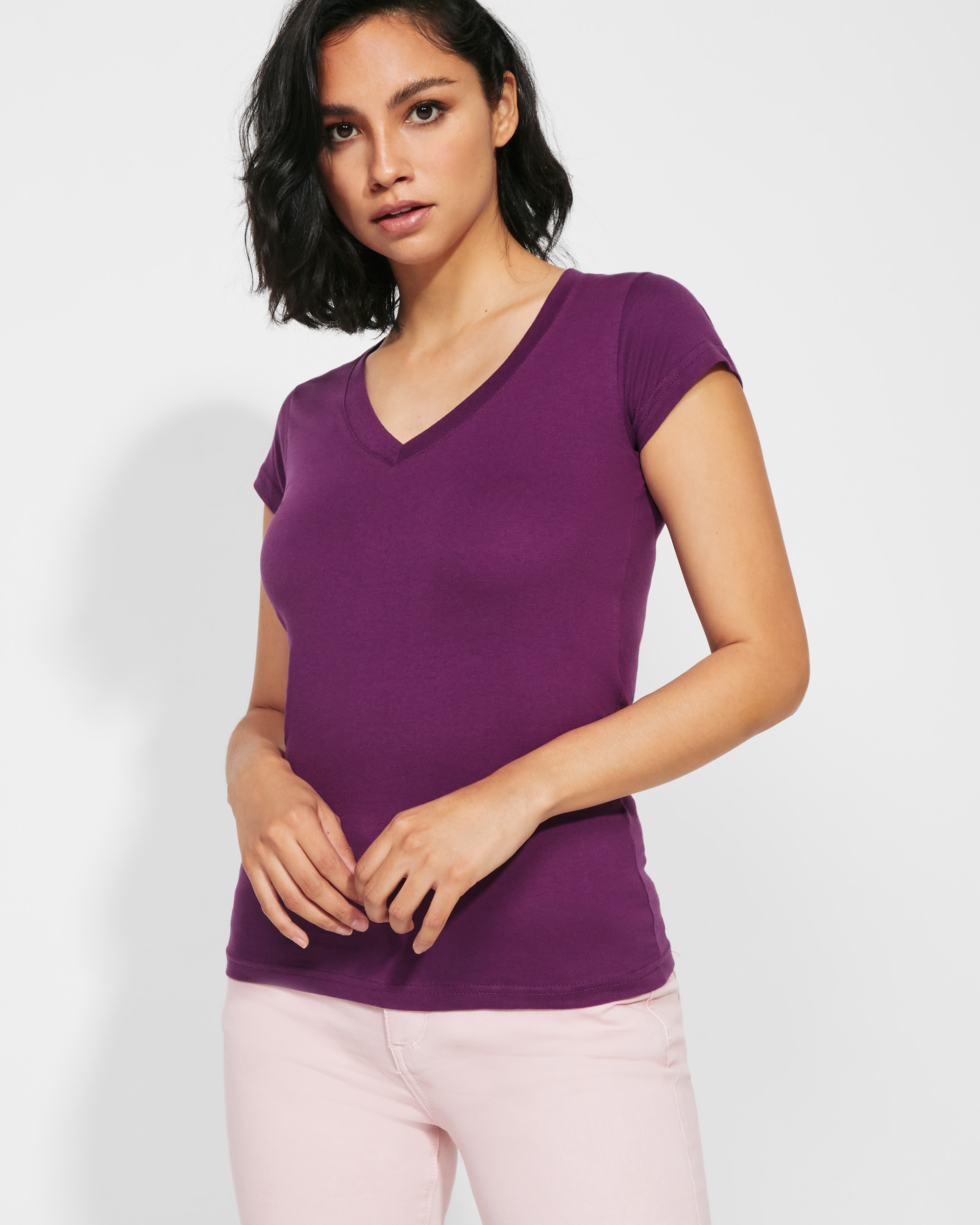Camiseta de mujer con manga corta, escote en cuello de pico y acabados en ribete acanalado. Corte entallado con costuras laterales.