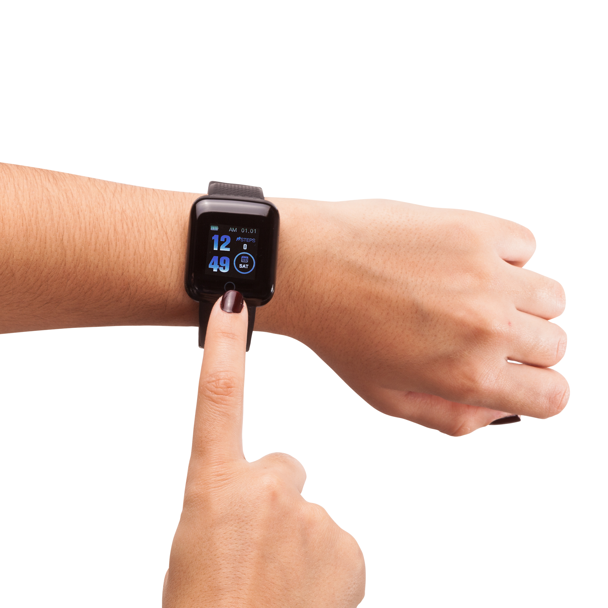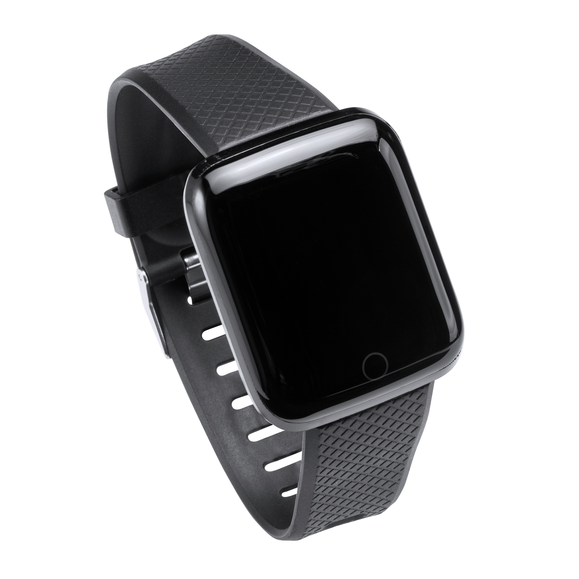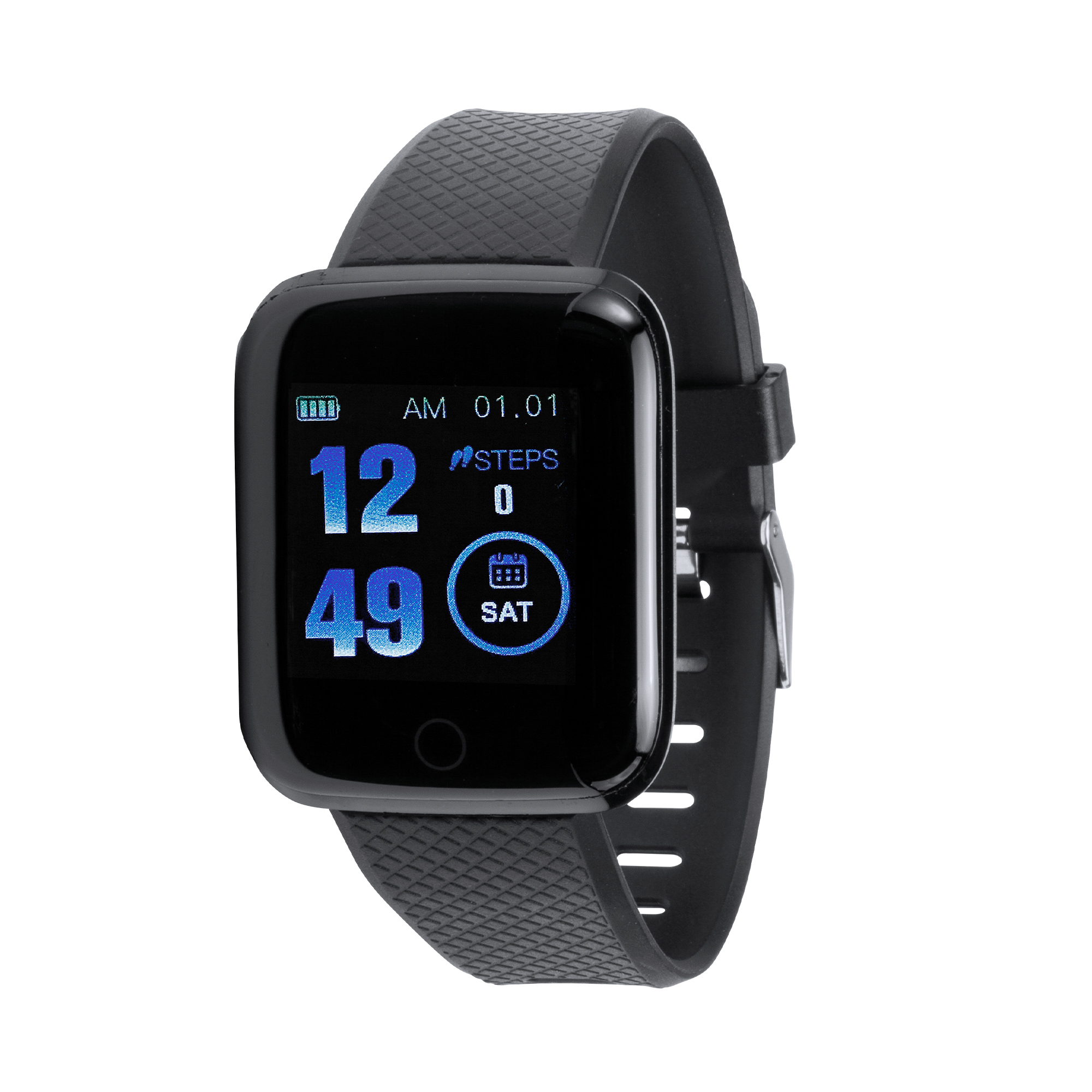 Reloj Inteligente con funciones de actividad. Cuerpo en TPU y pantalla a color TFT 1,3″ con USB de carga integrado. Correa ajustable de silicona y hebilla metálica. Monitorización de frecuencia cardíaca. Conexión Bluetooth con APP para iOS y Android.